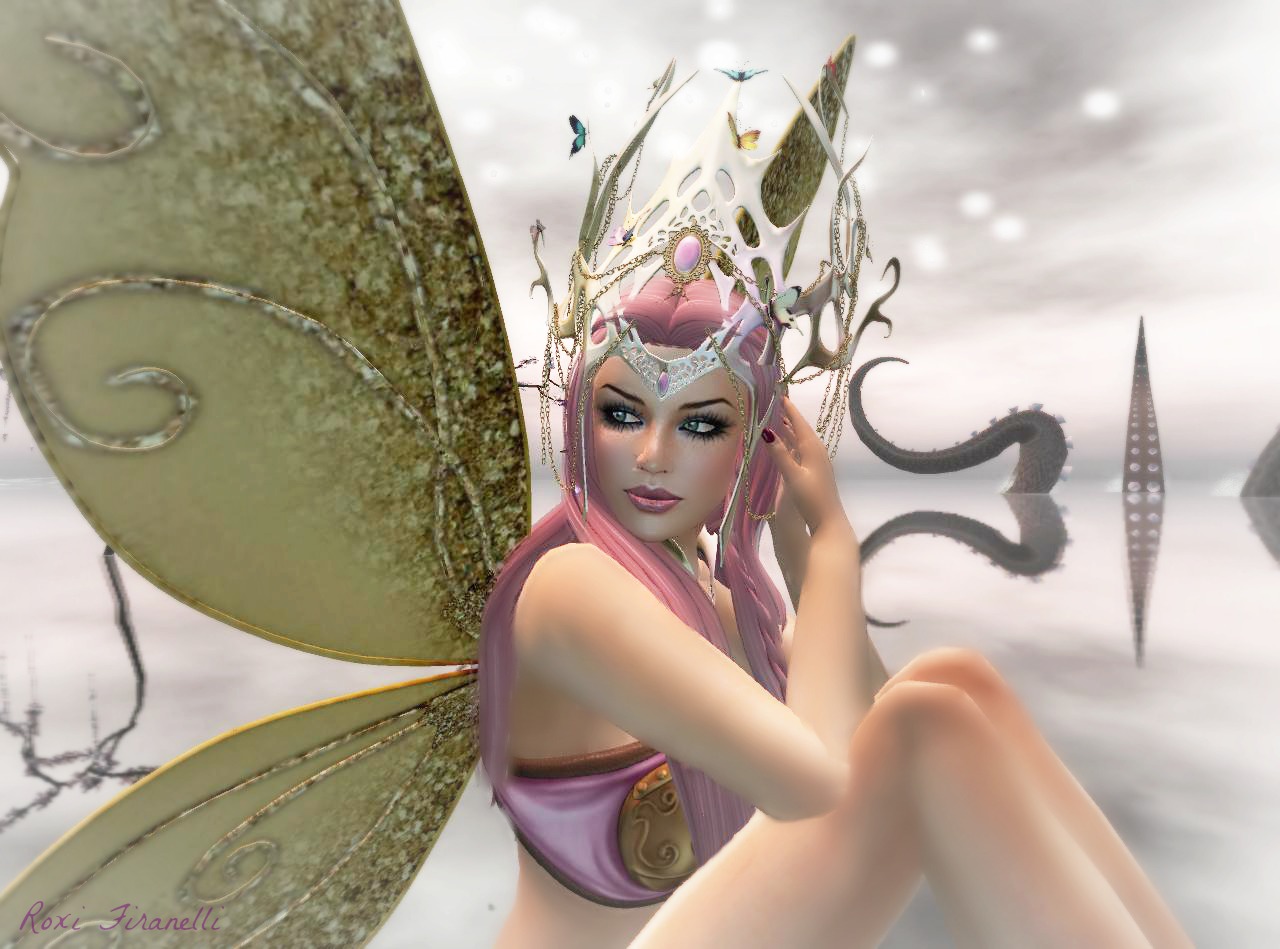 So I have these awesome Gold fairy wings from Una….and I may or may not be a wing ho….the rare ones from the Fantasy Gacha Carnival…and I sooo want to wear them. They’re so girly and delicate and they speak to my need for sparkly things. But what do you wear with golden wings? They just don’t go with everything ya know….kinda ostentatious. (whoot, big word for the day!) Then, while I’m roaming the Fantasy Faire I walk into .aisling….I freaking love everything from .aisling….and I see this crown. But not just any crown (I may be a crown and horn ho too), this crown is spectacular…pale gold, delicate…like it was carved out of gold ivory, with draping chains, inset jewels and little butterflies resting on the edges. It sits on the forehead just like I like, perfect for when you are wearing a hair with no bangs. The crown is perfect with the wings and sits like it was made for the Wasabi Pills hair from the Faire. Being a fan of pink hair (and blue, sometimes purple, occasionally green) I looove how Wasabi puts out the crystal colors for events, and the pink crystal pulled everything together. And finally, because I wasn’t feeling the nakie thing (it happens) AND I hadn’t yet taken off my Huntress top from Alchemy, I just put the HUD on and changed the fabric to pink….walaaa! Ready for a night out in fairyville 🙂