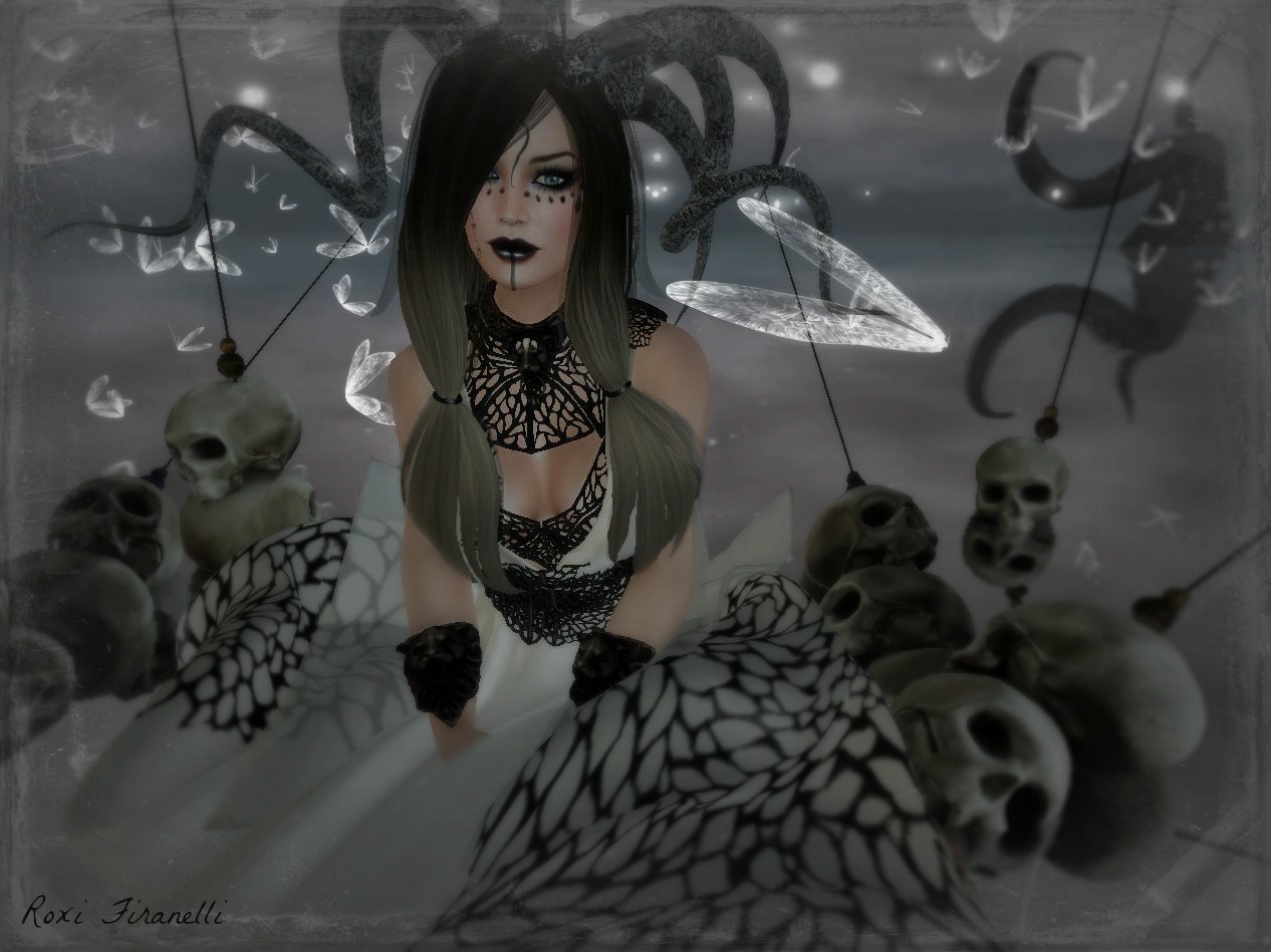 I wound up at the Aisling store the other day, it’s their 1st anniversary and there’s gifts involved…no cake to be seen….but cool gifts(if it’s Aisling…it’s cool). I spied the Quarth dress and both Darth and Rhenu said it looked fabulous on, so I was sold…along with the lace chestpiece….delicate and kickass at the same time. Both come with color change huds for the fabric and the metal lace….you gotta love that. The gold lace looks spectacular, but I went with the black for this to match the cool tattoo’s from the FGC. The hair? May be the only time I ever wear brown hair, but I got it at the FGC also and its a rare…and I like it…so there. Anyway, I’m at Aisling spending away when I see the gifts….the ones that really stand out are the skulls….on sticks that make them look like hor d’oeuvres. And I think for a minute…what the hell would I ever do with skulls on a stick….hor d’oeuvre skulls…but then it hits me….Charlie (my octopus) would like a snack….he’s a classy ass octopus and would love a hor d’oeuvre to break up the monotony of chewing on newbs. (I don’t get out much)