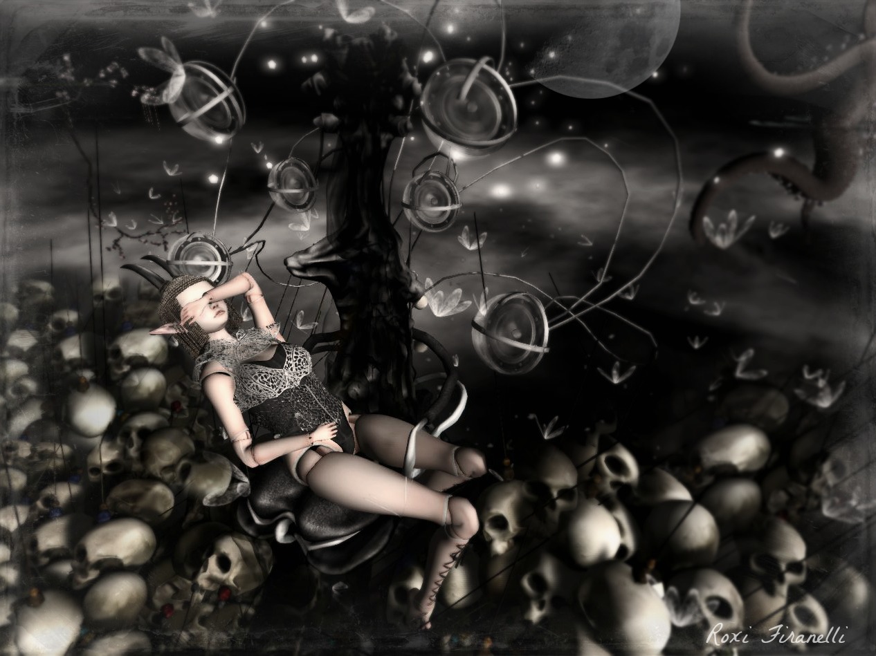 Looks like she ate to much huh? 🙂 Just an excuse to wear the Seth headdress from Pure Poison. And sit in the bad ass tuner chair from {anc}. And possibly just for the fun of being surrounded by a plethora (big word for the day) of . a i s l i n g . skulls. Cause you know, a bad ass chick in a chain mail headdress (with horns no less!) would be right at home sitting in this chair and snacking on things with skulls (lets not even go into what things)…and she probably named her octopus Charlie.