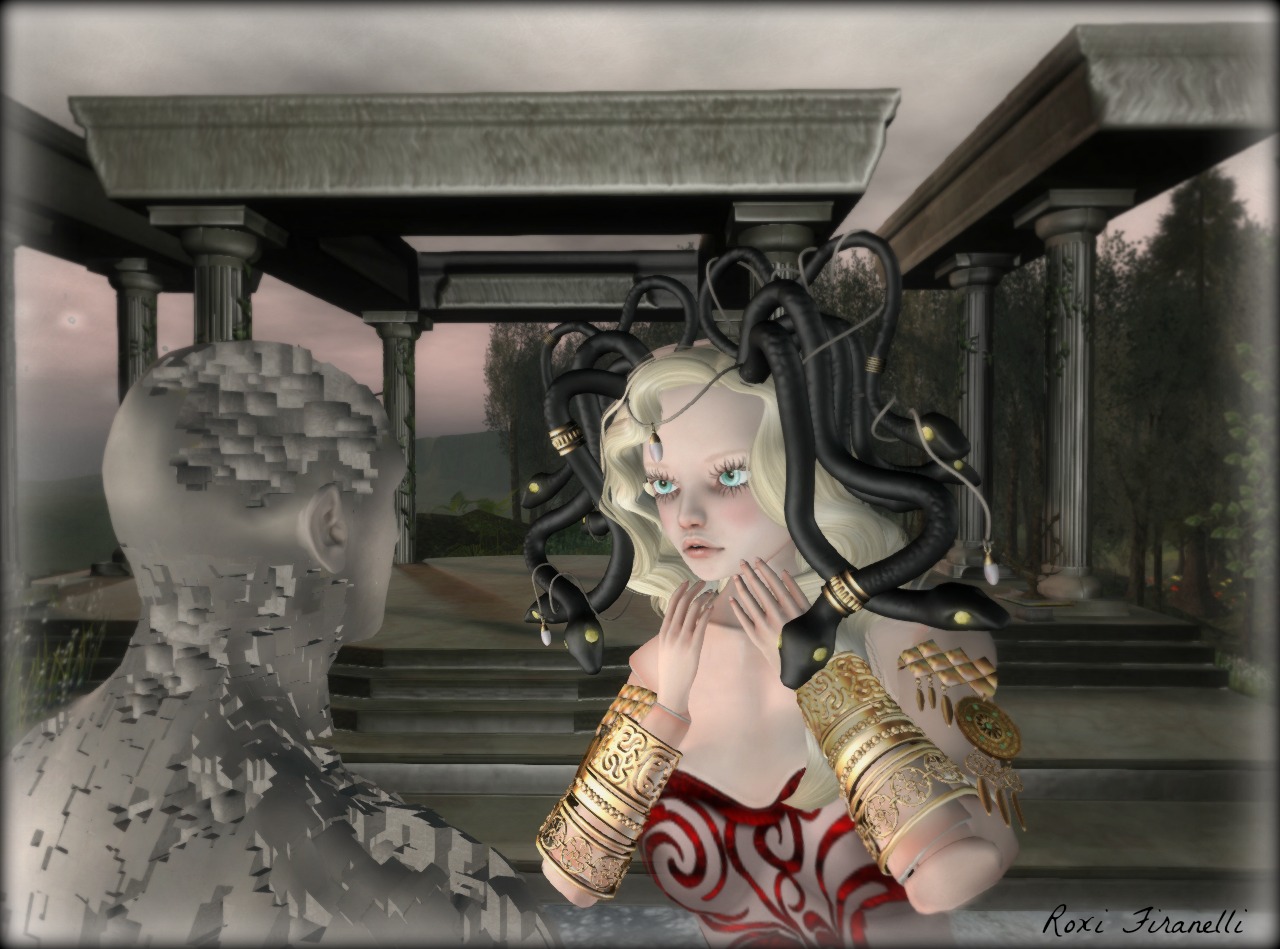 The pose, from Elephante Poses, is called Stone Goddess and is available at Tales of Fantasy along with the Medusa hair from May’s Soul, the bracelets and arm cuffs from Aisling and the Celestial orb from Collage. The fabulous hair (which is what started all this), is Pria, from EMO-tions.
