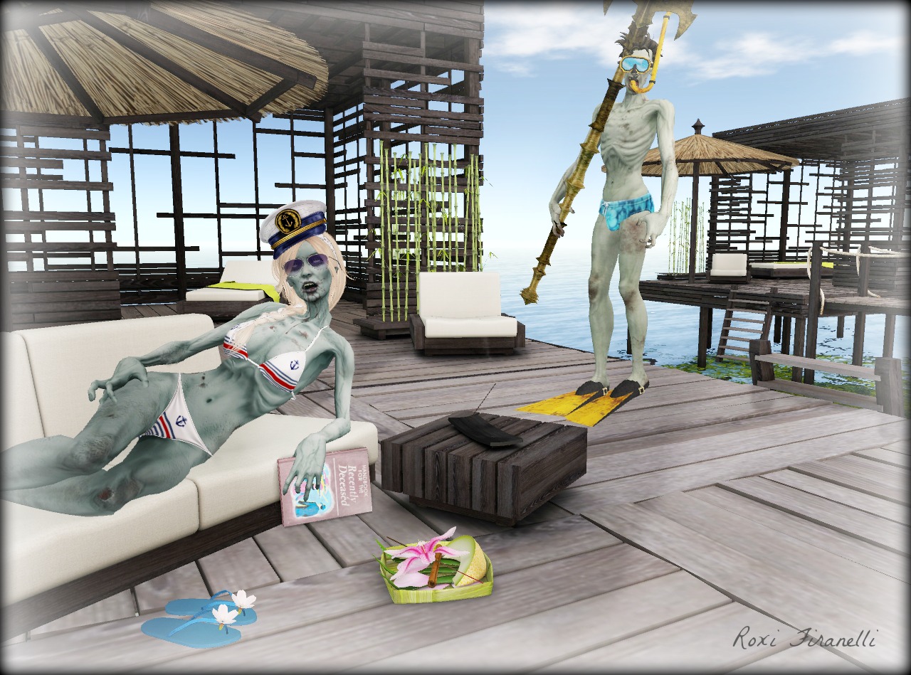Zombie Roxi saying “Okay honey…have fun!” (but thinking) “Why the hell can’t we just go right up the road to Olive Garden??? Hope the cheap bastid gets eaten by a shark”