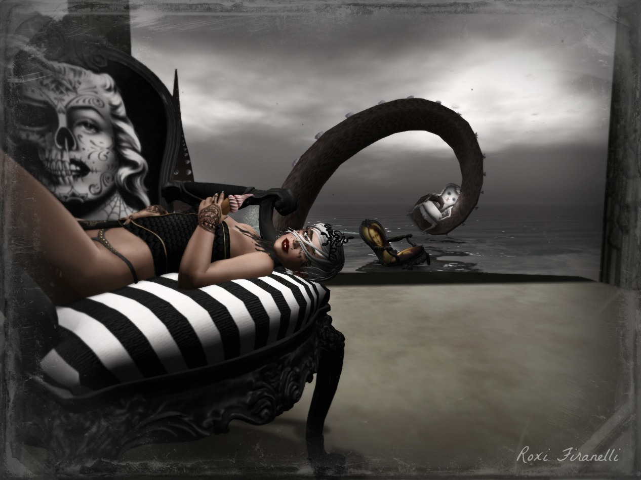Sometimes an opportunity to get an interesting picture just presents itself and you can’t pass it up. Alles was kind enough to scatter her fabulous new Boudoir chairs on my beach while opening them. As we ooooo’d and ahhhh’d at each she may have mentioned keeping the kitty chair away from Charlie. Oops (in my defense, he has very long tentacles)
