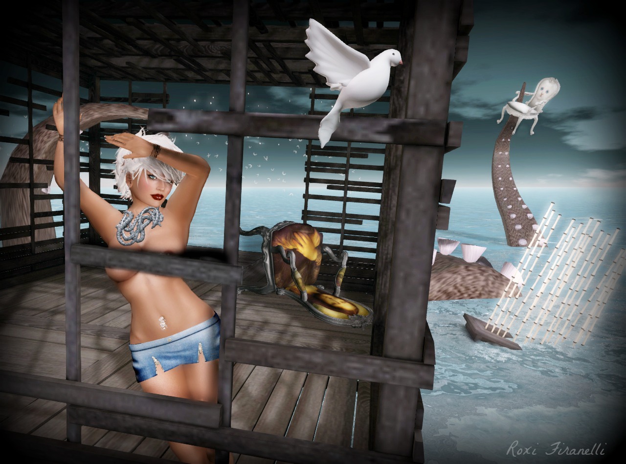 Only a blonde would send a dove for help…(apparently there were no carrier pidgins available, silly dove’ll probably come back with an olive branch…….that’ll help( insert eye roll here)).  I fell in lust with this octopus necklace from 22769 and just had to use it in a Charlie picture 🙂  And sorry, I know the skirt is awesome…amazing texture….but its retired from Finesmith 😦  And finally… (2 sentences starting with “and”…tsk tsk…this is why I don’t teach English)…perhaps one day a hero will come along and save kitty chair from the evil clutches of the marauding octopus (whoot…big word of the day!)…doesn’t she look scared!