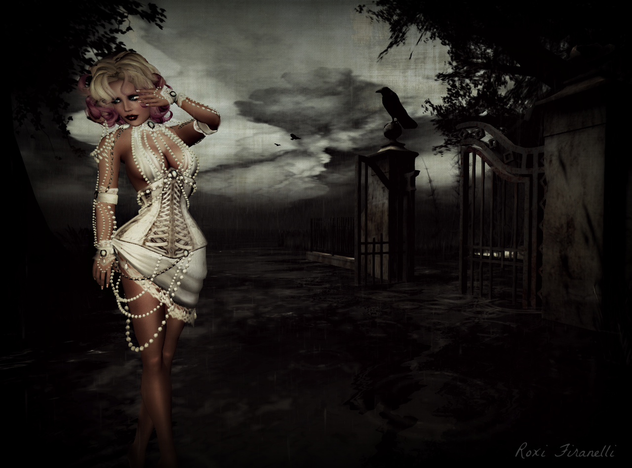 I’ve been meaning to get over to H220 for some time. By now, everyone’s seen pictures of the flooded, rainy sim. With the right windlight…its dark and ominous and waiting for a mystery to unfurl. The House of Usher could easily fit in behind the ancient, broken gates (google it!). I’ve also been waiting for the right opportunity to showcase the deviousMIND dress from The Secret Affair. All wrapped up in satin and pearls…its decadent and sexy as hell. Its begging to be worn by a mysterious woman with deep secrets and deeper desires. Know of any?