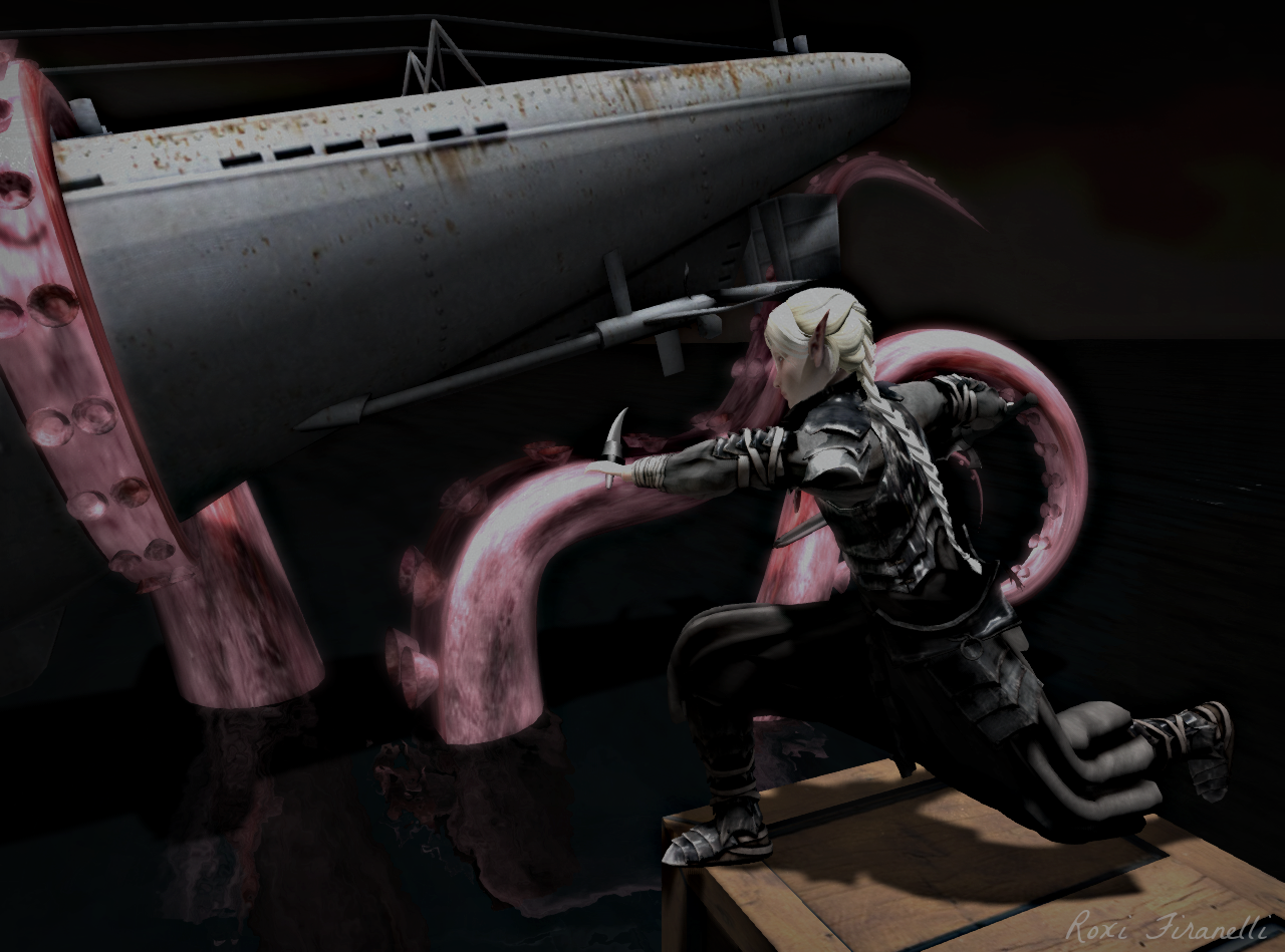 I had been wandering with some peeps at this really interesting sim called Circus of Sins. Interesting is a nice polite vanilla word for this place btw. When you rezz in, one of the first things you see is this ship/sub being pulled under by a shockingly pink octopus. That did it for me as I have a well known affinity for a cute octopus. So here Ben is, wearing his kick ass PFC outfit and getting ready to save the world from a crazed marauding pink octopus. It could happen. There are stories such as this one waiting to happen all over the sim with photo ops everywhere….many that can’t be put in a pg Flick’r stream. It is not for the weak at heart or for anyone with leanings towards prudishness (hell, the plane flying into the giant vajayjay made me squirm (and not in the good way). Makes the elephant stomping a man into the ground or the alligator eating a guy look docile by comparison. Perhaps for my next guy pic I’ll go save one of them…..or go sit on top one of the giant boobs squirting milk. Gotta go see now, don’t ya!?