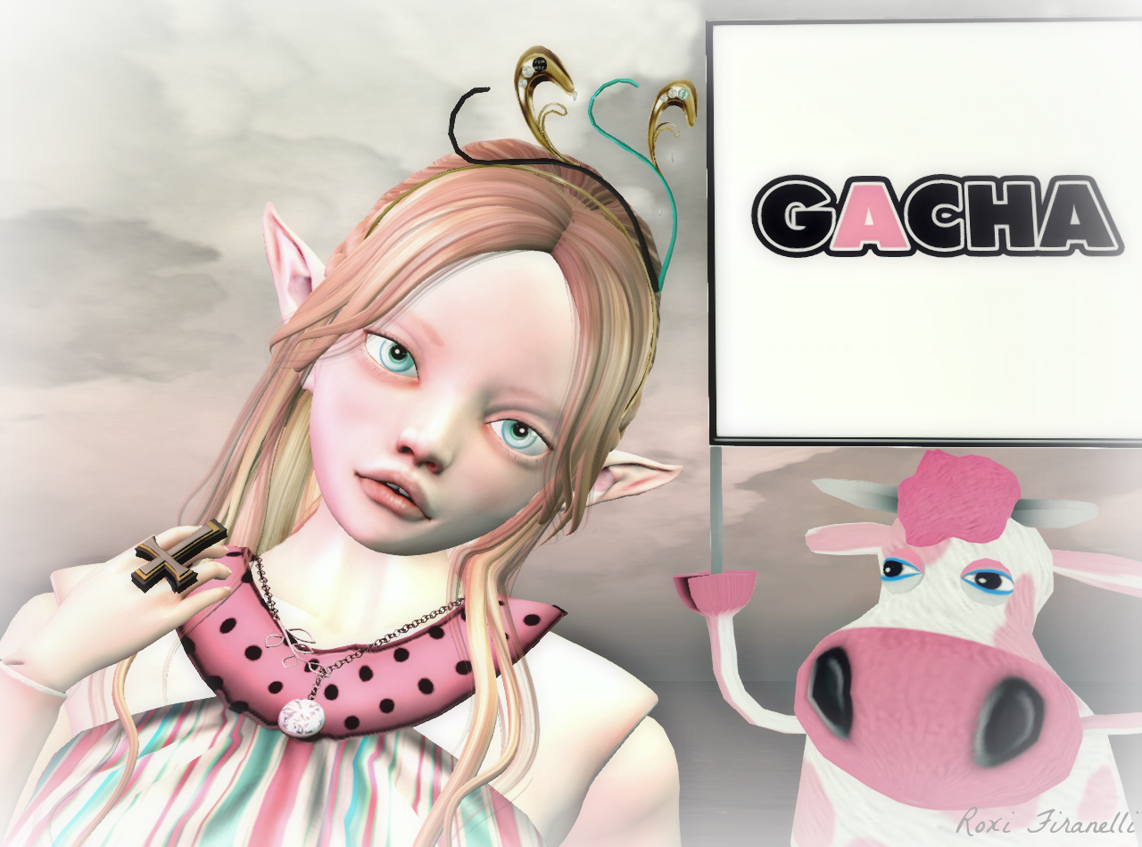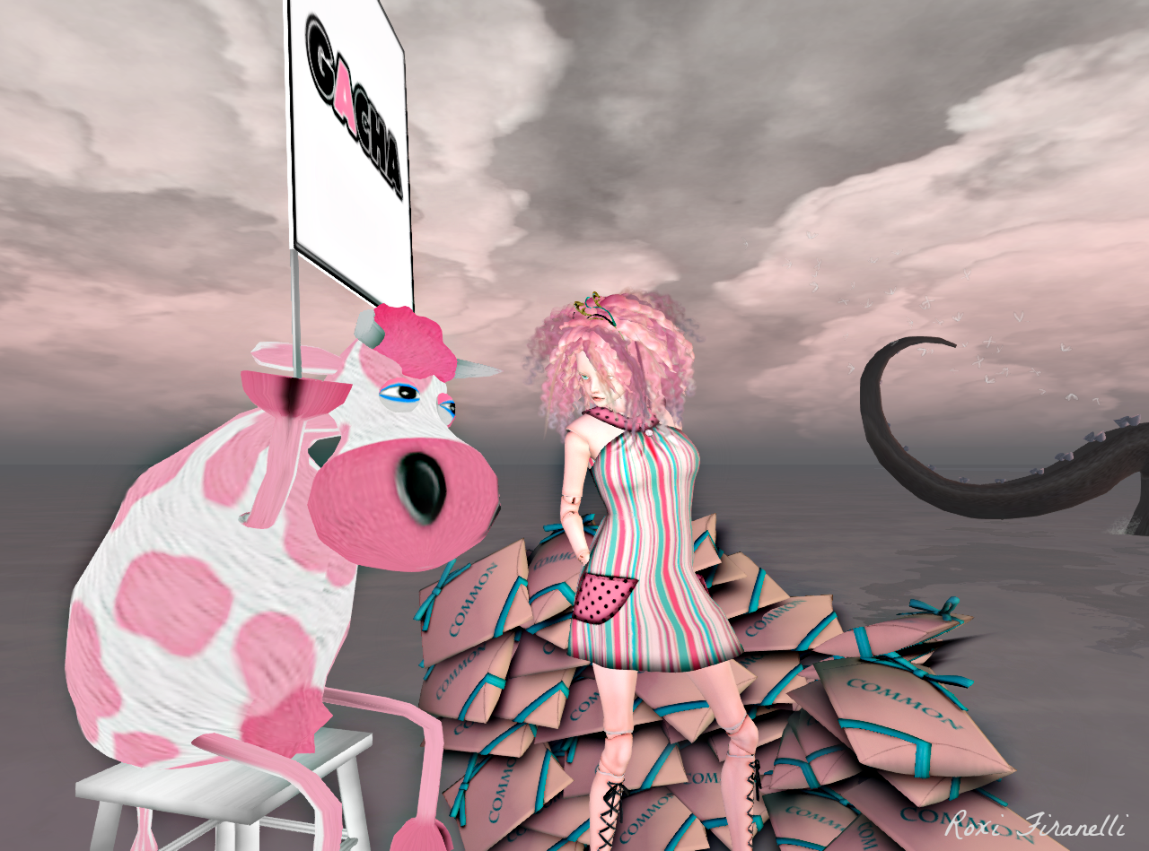 Mmmhmmm…you know….been there done that. The Pre-Release Gacha Garden is hosting a new round this month with some fun goodies and guess what one of them is?! Go ahead…guess. You’ll never guess…so I’ll just tell you. A gacha machine. MMhmm, a gacha machine. There is a gacha for a gacha machine. Gacha machines inside a gacha machine. I know, anyway you say it it sounds funny. Ohhh but wait…they’re COW gacha machines! Even funnier! You know you want you’re very own gacha machine!! I had to pull the pink one…cause well..ya know…a pink cow gacha machine….it doesn’t get any more surreal than that 🙂 Not to mention it matches the pink sundress from dirty little secrets (she abbreviates it to d.l.s., but I reeeealy like saying dirty little secrets). The pile of commons is from a Nantra pose called (appropriately) “Gimme my f*#@*ing RARE!”