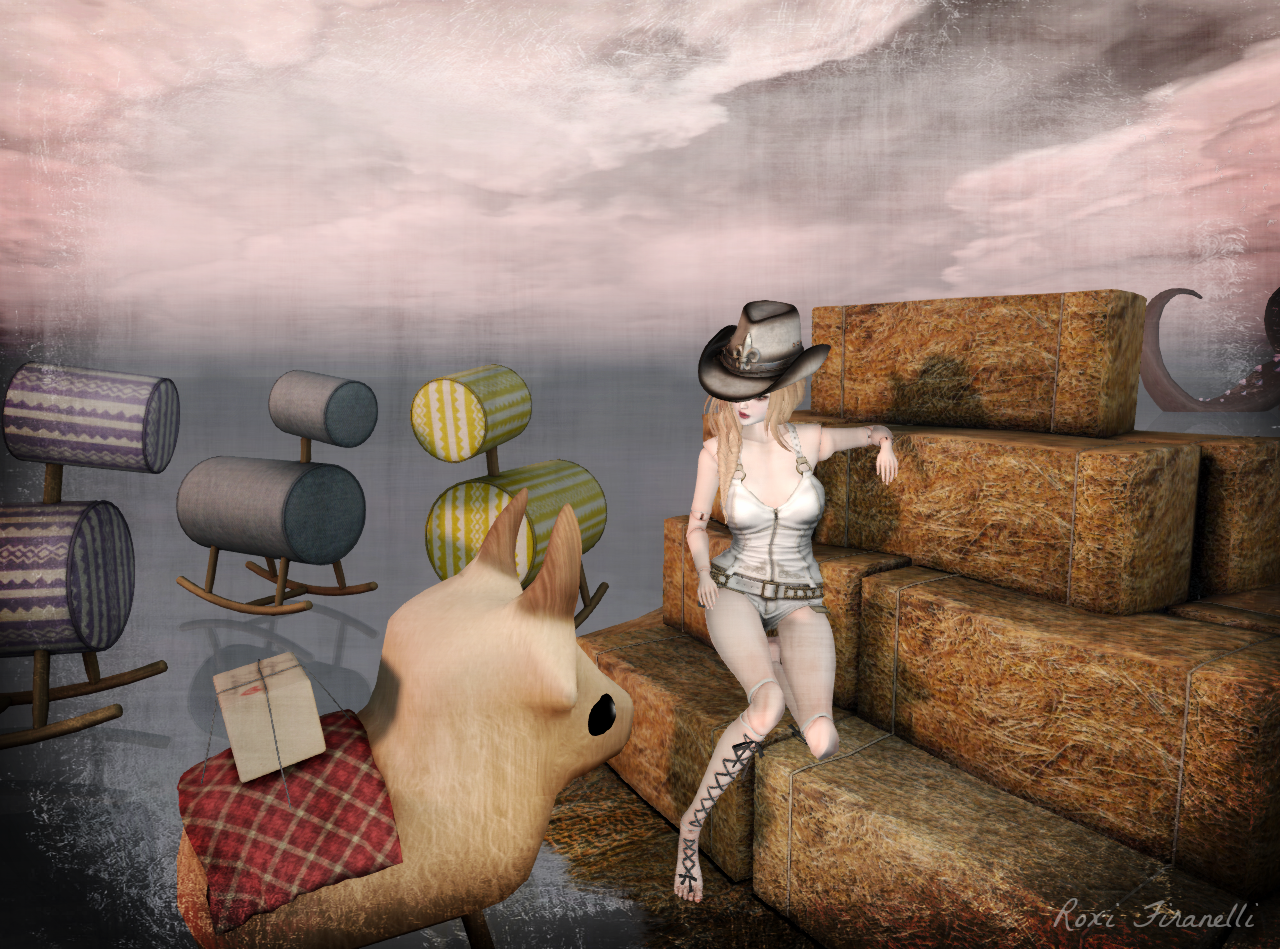 I was feeling in a cowgirl mood, which is fitting as the Wild West Fair opened today with all manner of western goodness.  The hay I’m hanging by is from Dyer Maker…an excellent pose prop with great single and couples poses built in…perfect for any barn, farm or range.  My mesh outfit is from MOoH! and comes in 3 separate pieces…top, shorts and belt….and fits perfect, not to mention matches my gunslinger hat from RO.  I sooo love that hat!
