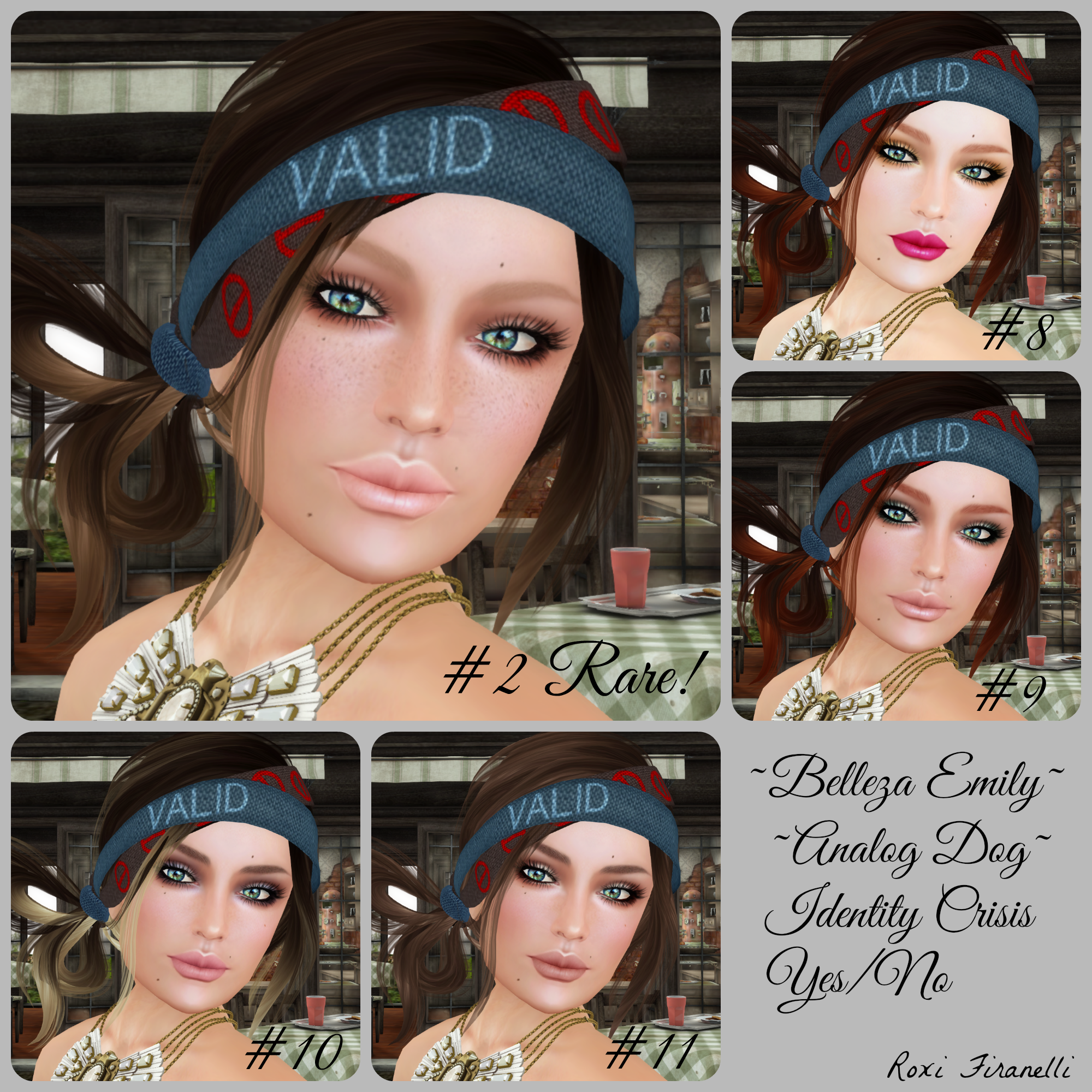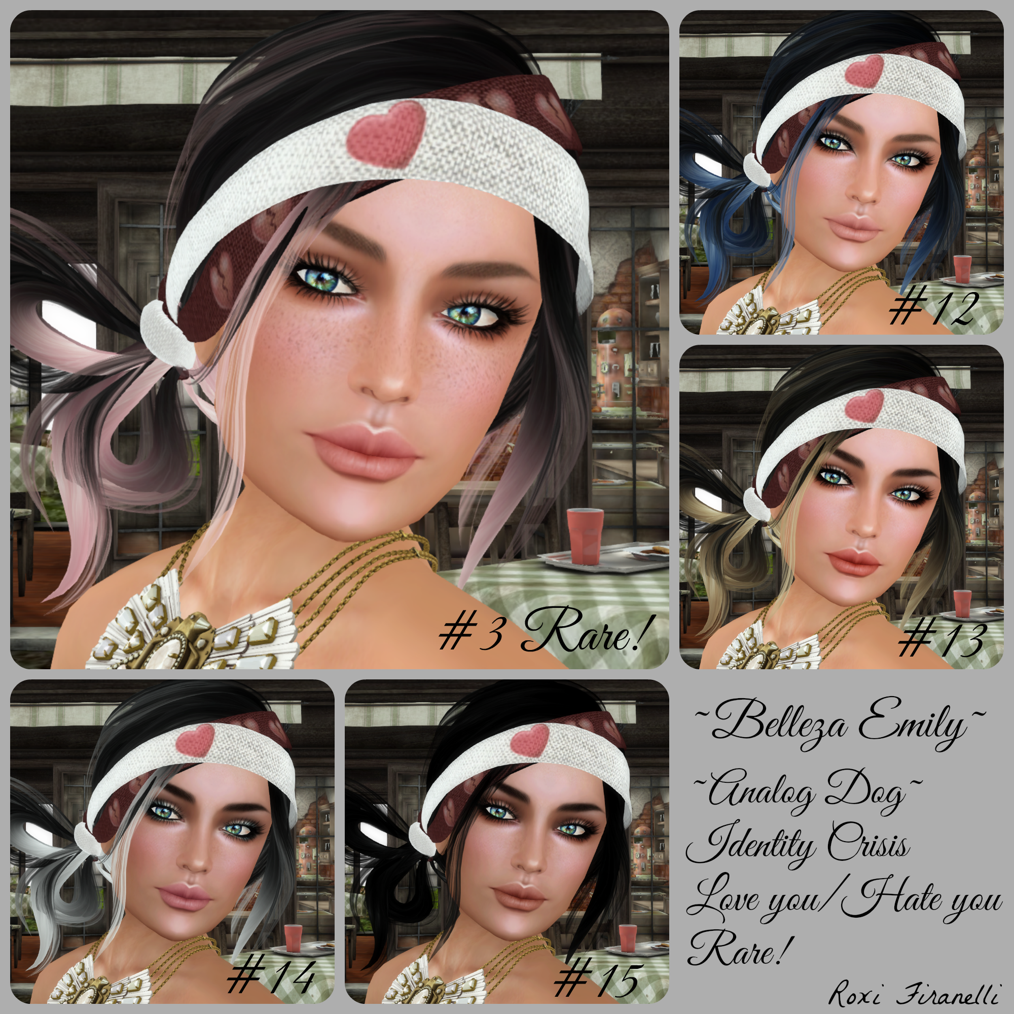 2 more fabulous must haves (and a teaser) from the newly opened Arcade.  Belleza has the Emily skin out, a soft, beautiful skin that everyone will love.  The rares boast freckles but all come with lip gloss and moles if you so choose to wear them.  Below are the lighter shades.  Paired with the Emily skin is Analog Dogs Identity Crisis hair…..Queue always makes the cutest hair for the Arcade!  The light skinned Emily is wearing the rare Hippy Mayhem hair, which comes in blondes.