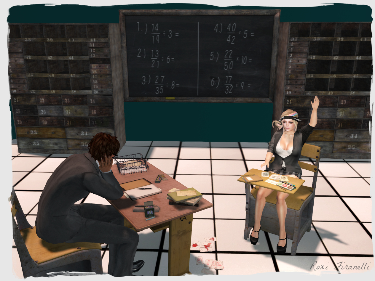 The Arcade is officially opening in 1 hour…..let the stampede begin!!! Sari-Sari’s contribution to the gacha event of the season is Old School, a collection of classroom pieces sure to bring back a memory or two in everyone. The chalkboard is my favorite, you can change the graphic to other subjects like geography. I chose math because math teachers looove their chalkboards….those are always the people with chalk all over their arms in Wal Mart after school. I personally am not a fan of math, I respect its place of importance in the world, but like nuclear fusion, electricity and eradicating the Ebola virus …I leave that chit to somebody else. I’m also wearing the Belleza skin and Analog Dog hair from the Arcade…both fabulous and both getting featured in the next post this afternoon, so stay tuned ❤