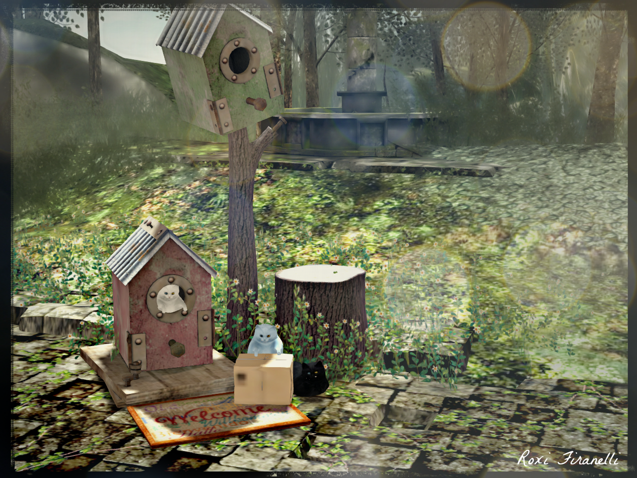 So when I see this stuff from Sway’s and .aisling., almost on the same day…I couldn’t resist combining. The fabulous birdhouses from Sway’s are at Uber…whose theme this round is apocalypse ….hence the ummmmm bedraggled condition. There’s one that you put on a wall and a free standing birdhouse on a tree stump….actually, it looks like it’s about to fall off… which only adds to the appeal. Also from Sway’s is the welcome mat…this is the international mat and comes with the delivery box (I added the free fud sign). I have the doormat with the kitty laying on it in front of the 8f8 Café, right by these kitties…..it looks perfect there. The fat cats……well there in a class of their own. You can’t not love them….and want to hold them and squeeze them. There’s 2 versions….the lazy cat (the black one) laying down and the Say Hi cat (the white and the blue cats) that you hold up and he looks like he’s waving. Did I mention that they’re fat? They are soooo fat…..