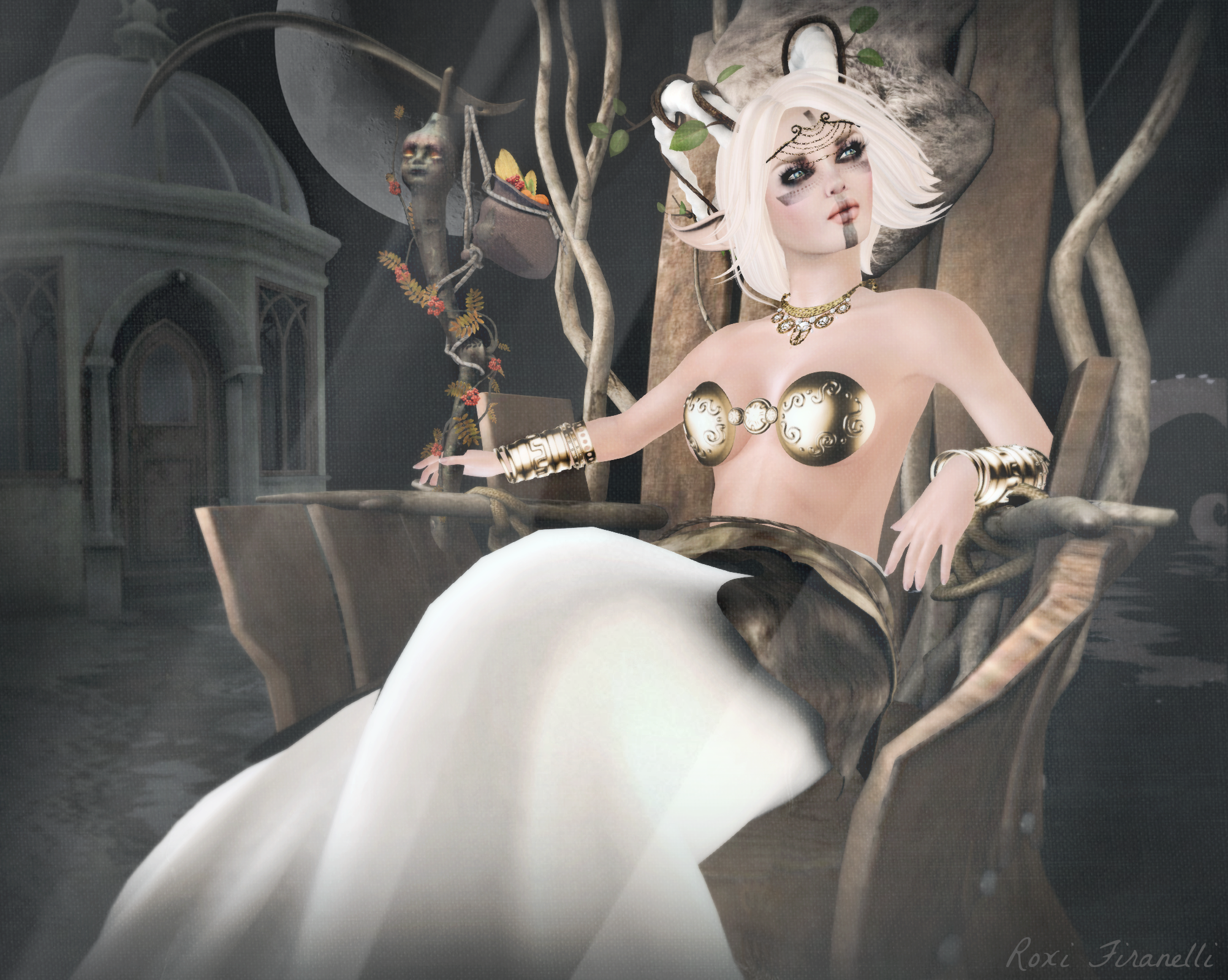 Incredible fabulousness awaits you at this round of The Secret Garden. You’d think combining so many designers would be a problem…like putting polka dots with plaid…but not so here. The theme for this round, Harvest Moon, has really brought out some amazing creativity and mix and match is the name of the game. The evil throne by DRD, the mystical Lunar temple by Ravenghost, the amazing outfit and horns by May’s Soul, the romantic hair by Entwined, the curiously odd scythe/staff by FDD, the delicate jewelry by Keystone and the Forge, the luminous skin by random matter and the almost warrior-like face tattoo by the skinner…amazing that these creations can come together and all be part of one story. Make your own story from the wondrous collections found at The Secret Affair….you’ll be glad you did ❤