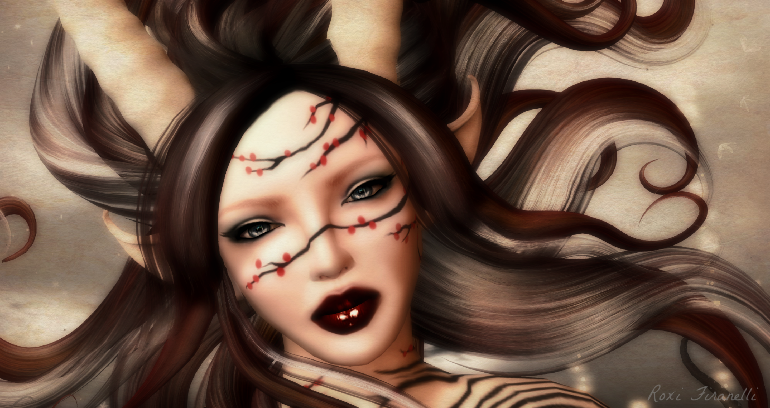 Did I say the tat was fabulous?  Well ya know, if it’s from Fallen Gods…it’s going to be fabulous no matter what.  It’s available at Gothmas by Gaslight along with the eyeliner and shadow I’m wearing.  The amazing horns are Tentacio..so kick ass girly.  They are at The Liaison Collaborative as we speak along with the gorgeous Lola skin from Belleza and the poses from Bauhaus movement.  I picked up the wild Mina hair, the eyes and the very cool twinkling light logs (I set them upside down for the shot) from Kustom9 the other day…all great finds ❤