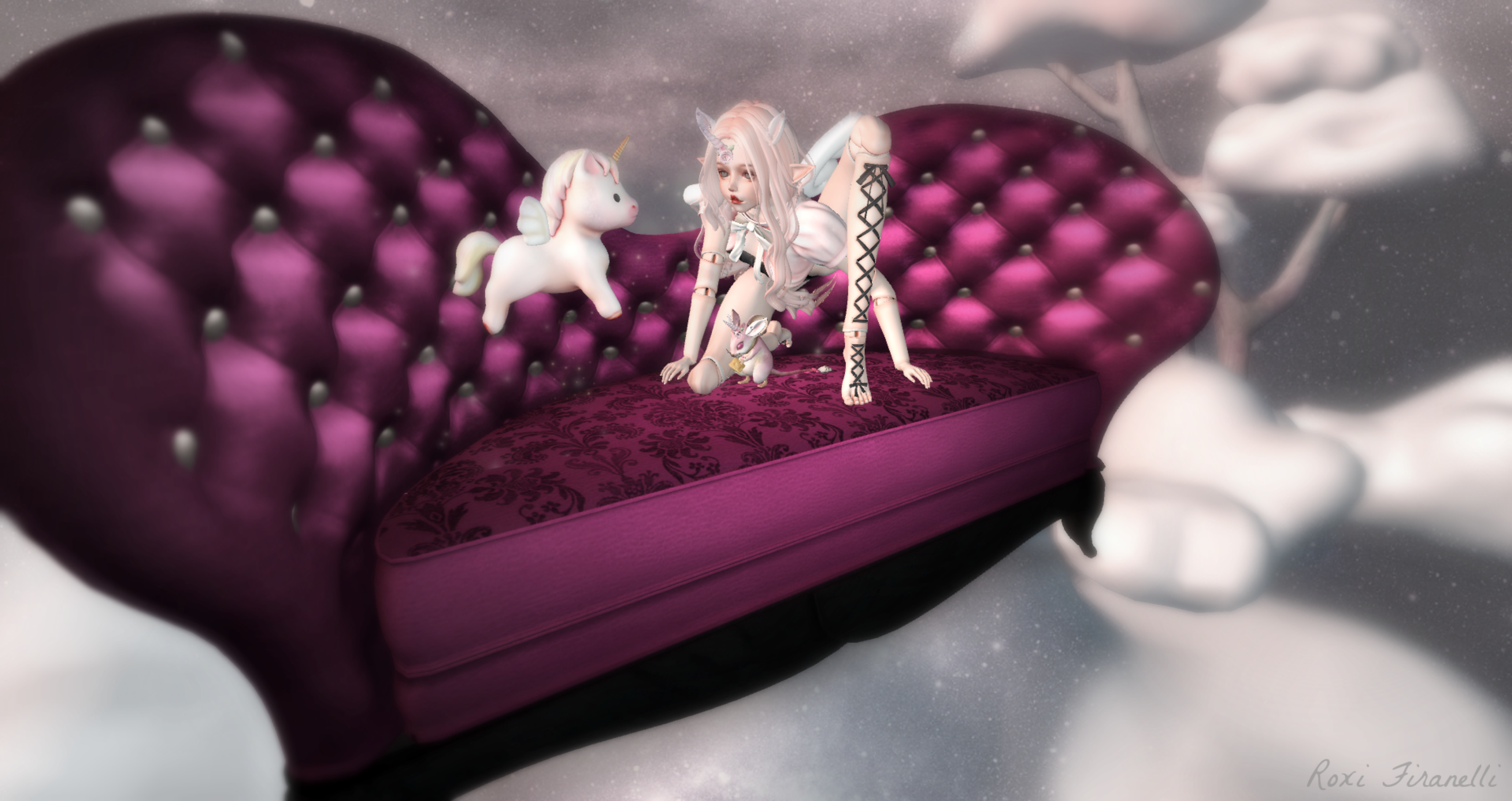 Who doesn’t love unicorns?? Who doesn’t wanna BE a unicorn!? That’s the theme for this round of Collabor88 and it’s proving to be popular. I fought my way in yesterday and had my shopping list in hand and my camming action ready to go. I scooped up the freaking adorable baby flying unicorn from MishMish, the horn w/ ears from Half-Deer (is there anything from Half-Deer that isn’t 100% ridiculously adorable….so cute I made a copy, shrunk it and plopped it on Annabelle!) and the super cute petal jacket from Atomic. Now that I was all pinked up, I popped on my new Electra hair (in pink) from Entwined that I picked up at We ❤ Role-Play the other day and sat myself down on the pink sofa that Boudoir has out at OMGacha, which JUST opened. The sofa is beyond gorgeous….and comes in 6 different colors (black, pink, blue, violet, green and circus) for the gacha…the multi colored Circus sofa is the rare…but I soooo love this one ❤ Pink pink pink pink…..sometimes a girls just gotta be girly. The cloud trees are from Half-Deer too…see…adorable!