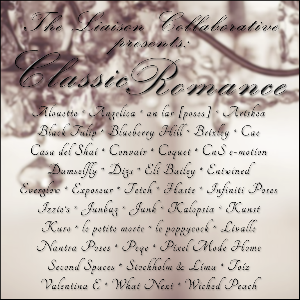 The Liaison Collaborative’s theme is Classic Romance..so get ready for silk and pearls and all things soft and sexy. I wasn’t sure I was going to take to the skin that le petite made for the event…then I tried it on….loooove at 1st sight. Also from TLC is Damselfly’s Owen hair…for guys…but I love it! My swan is part of Le Poppycock’s White Rush Pose…one of the Yesternight’s Dream pose set for the TLC.