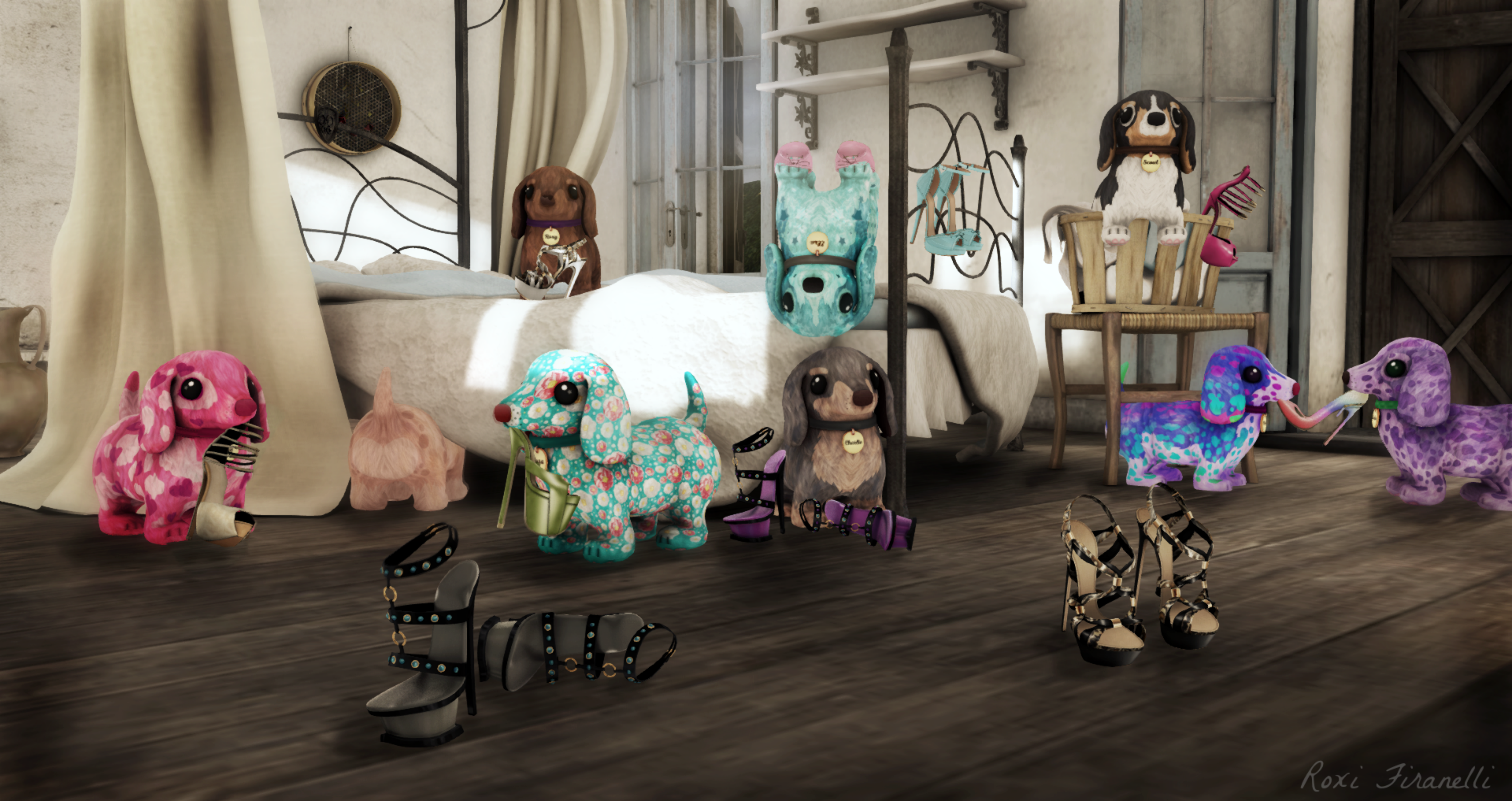 The party is happening at 8f8’s Primavera in Toscana Manor house…ya know what that means….doggie hairs all over that gorgeous bed! The wildly popular 8f8 set is available at The Arcade till the end of the month. The adorable weenie dogs from silentsparrow are also at the Arcade. Truthfully, I hadn’t paid them much mind till Kei (of Kei Spot) dropped one named Roxy on me last week…that’s her (Roxy) sitting on the bed like a puppy princess surveying her domain. I fell in love instantly and had to have a few (errr…a lot) more ….damn you Kei ❤