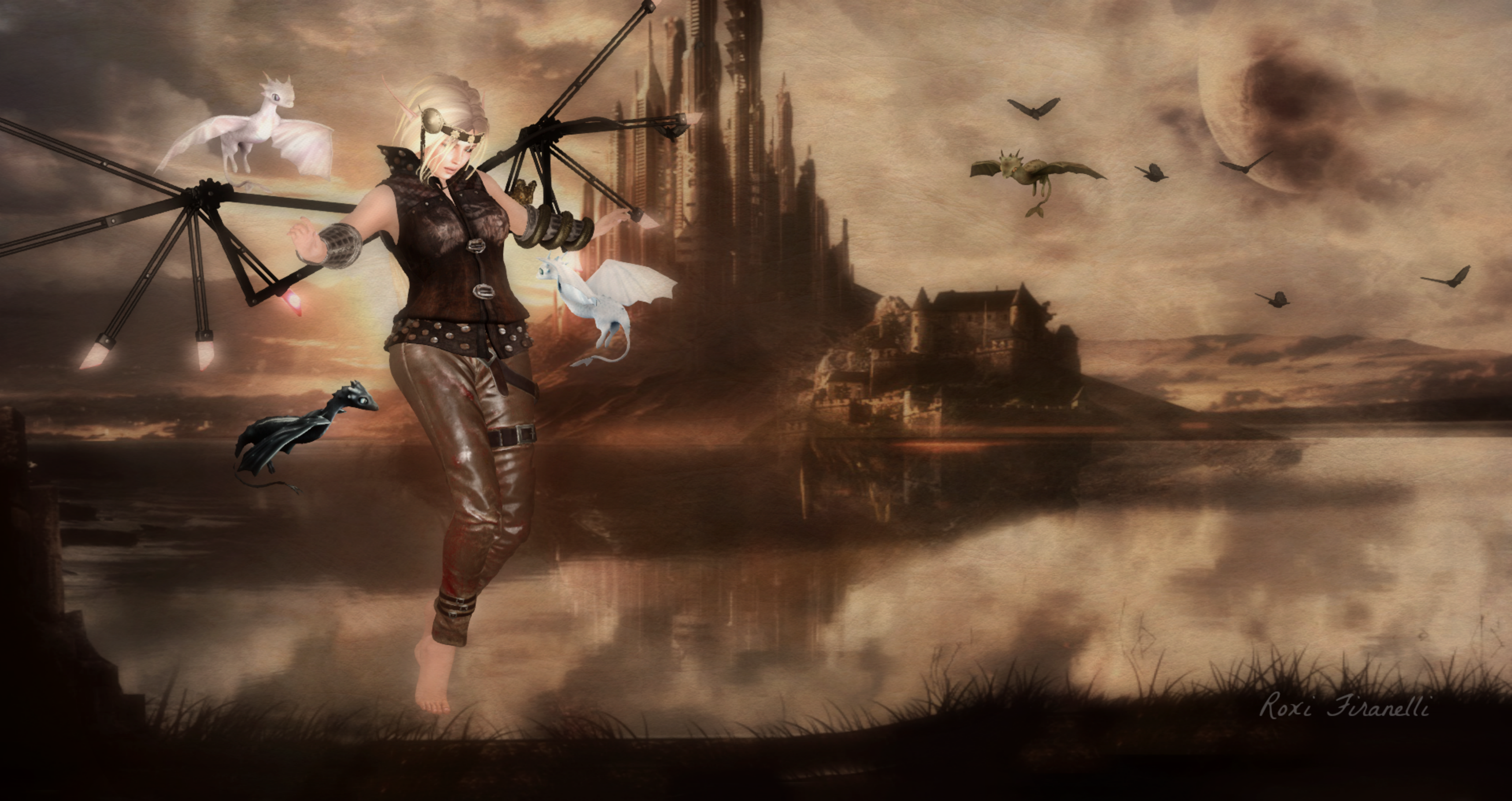 Speaking of dragons…how adorable are these baby Solstice dragons from Half-Deer!?  I couldn’t live without them…almost all of them in fact…I got a couple from the Arcade (that’s right, I got in) and the others I picked up at the Pea’s yardsale (smartest idea EVER).  If you haven’t been to the Pea yardsale….go…just to check it out.  It’s amazing in it’s organization.  Instead of an individual getting a table and putting all their things on it (making searching for something in particular a nightmare), plots are set up for each creator, alphabetically, and everybody puts their resale items from that creator in that section.  BAM.  So… unless you live under a rock in SL, you know the Arcade gacha opened yesterday and has been a madhouse.  I would looove to know how many lindens are played on the 1st day alone.  In my small part of the real world, the success of Mardi Gras is measured by how much garbage is swept up the next day.  In pounds.  So the more tonnage…the more successful the day was.  Weird right!?  Anyway, I’ve started measuring the success of a given collection from the Arcade by how many items of that collection are set up for resale in the designers sections at the Pea.  Some of the sections are empty….some have mountains of stuff so tall that Frodo would turn away from it.  My thinking is that there was some serious play action going on at that gacha machine (in search of the elusive rare and extra rare no doubt) that created a ginormous surplus of duplicate commons…henceforth known as the mountain on the Pea 🙂  Also acquired from the Pea was the Mercenary vest from Remarkable Oblivion (okay, I picked up all 5 of the chick versions…you never know when you’re going to need to be a merc and RO is awesome) and these ridiculously cool wings from AITUI…not only because they are cool…but I have a thing for wings >3