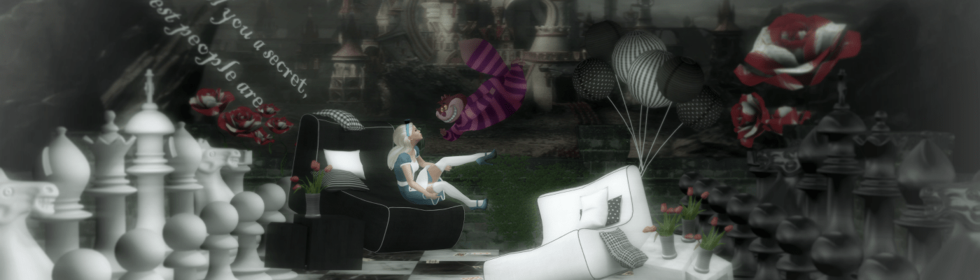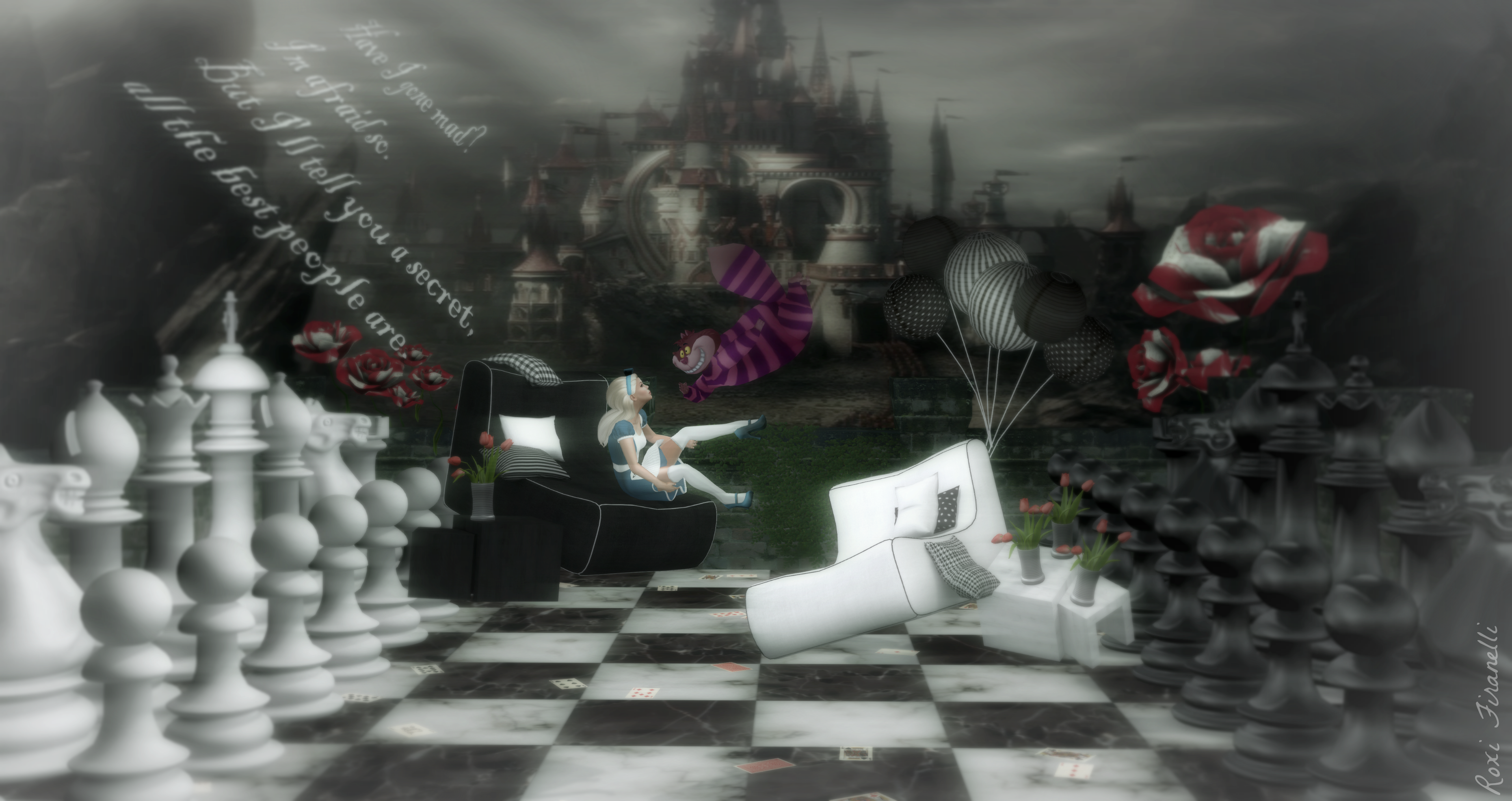 Who doesn’t love a good Alice quote huh?! I was sitting on my platform (why I wonder, do I own over half a sim and have 4 lovely houses and still spend so much time on a platform?) minding my own business…just sitting on these gorgeous chairs that Sway has out for the MIX event…waiting for inspiration to hit. Instead of inspiration, I got Darth…who said I should shoot them on a black and white checkerboard. Hah! (here’s where MY inspiration came in) I have that ridiculously interesting life size chess set from Boudoir…and the giant roses…and, and, and…and a cool Alice avie…bam! Next thing I know…and people, this is way past midnight last night….Darth pops on a Cheshire cat avie he got off the MP (for under 100L…like the weird amount of 93L I think!) and photobombs my shoot. We decided it looked good…especially with the 2 poses I had from Roquai…so we went with it. Inspiration comes in the oddest forms ❤