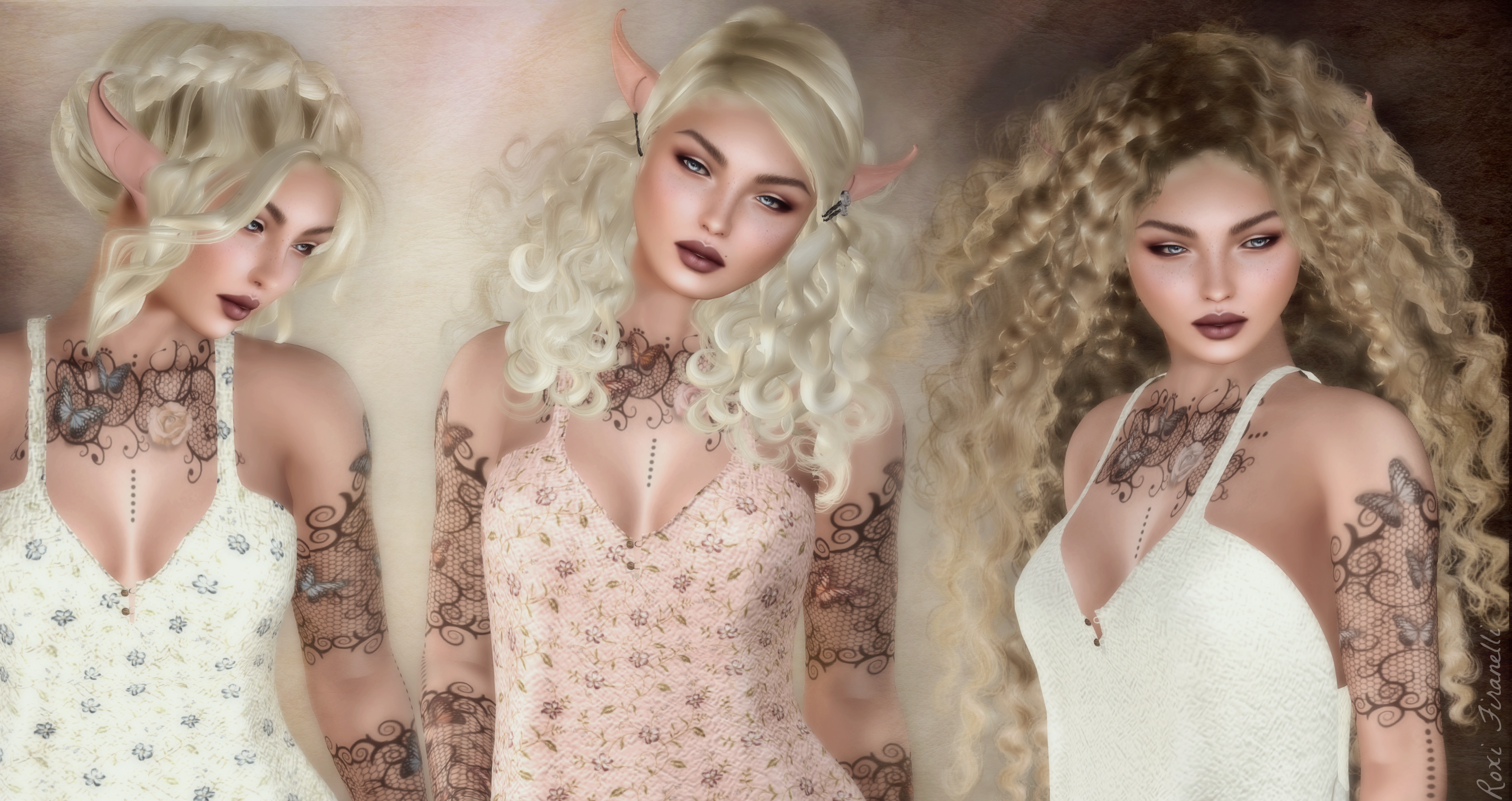 My 1st preview are the hairs from Analog Dog….gorgeous. To the left is molly, a soft braided updo…the bangs are the free gift and will go with any of the hair styles. In the middle is psylocibin, with adorable hair clips holding the curls away from the face for a perfect frame. On the right is sassafras, my favorite, a riot of curls flowing down the back ❤