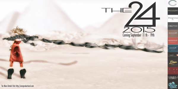 Cultured The Magazine, Designing SL, Dope Magazine, ECLIPSE Magazine, HomeStuff, iNOVARE Magazine, L’Homme, MenStuff, ModeLS Magazine, SCALA, Siren Productions, SL Live Radio, and WomenStuff are kicking off The 24 2015, the summer time staple, September 11th-19th 2015. We are taking it back to it’s roots with bigger designers, bolder designs, and we are bringing back the home and furniture designers. All limited editions exclusives for the discerning individuals in Second Life who like to be and individual and unique in what they wear, how they look, and the environment that surrounds them. Do not Miss Out on This Event!