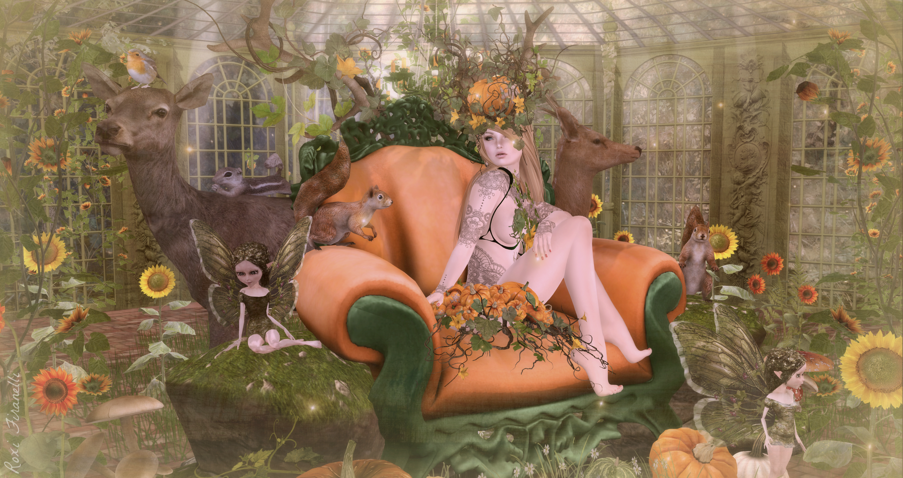 Remember the summer greenhouse from Boudoir (seriously, it was the last post)? Yep, here it is again. Well, Fall is almost upon us (thank goodness) and with that comes Boudoir’s Fall Faery outfit and wearable throne….mmhmmm…who doesn’t want a wearable throne, ya know….for when your out and about. This throne comes with all the surrounding faery and woodland creatures…as well as a goodly supply of pumpkins. The headpiece that accompanies the faery outfit also sports a pumpkin, as does the skirt. How better to bring in the season…and the cooler weather!? ❤