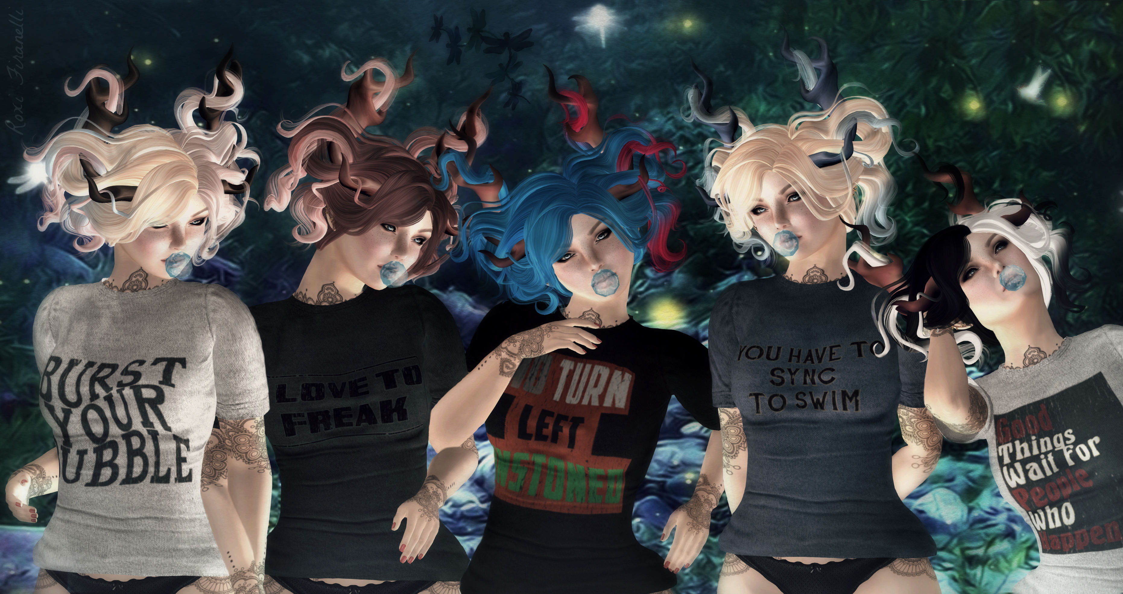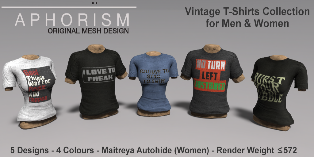 From The Men’s Dept. (I know, but it’s unisex!) Aphorism brings us cool vintage t-shirts….with a cute twist to the sayings. There are 5 sayings and 4 different colors…go nuts. As always, the render weight is low low low…@ 572 (or less!) and the girls version comes with Maitreya autohide … whoots! ❤