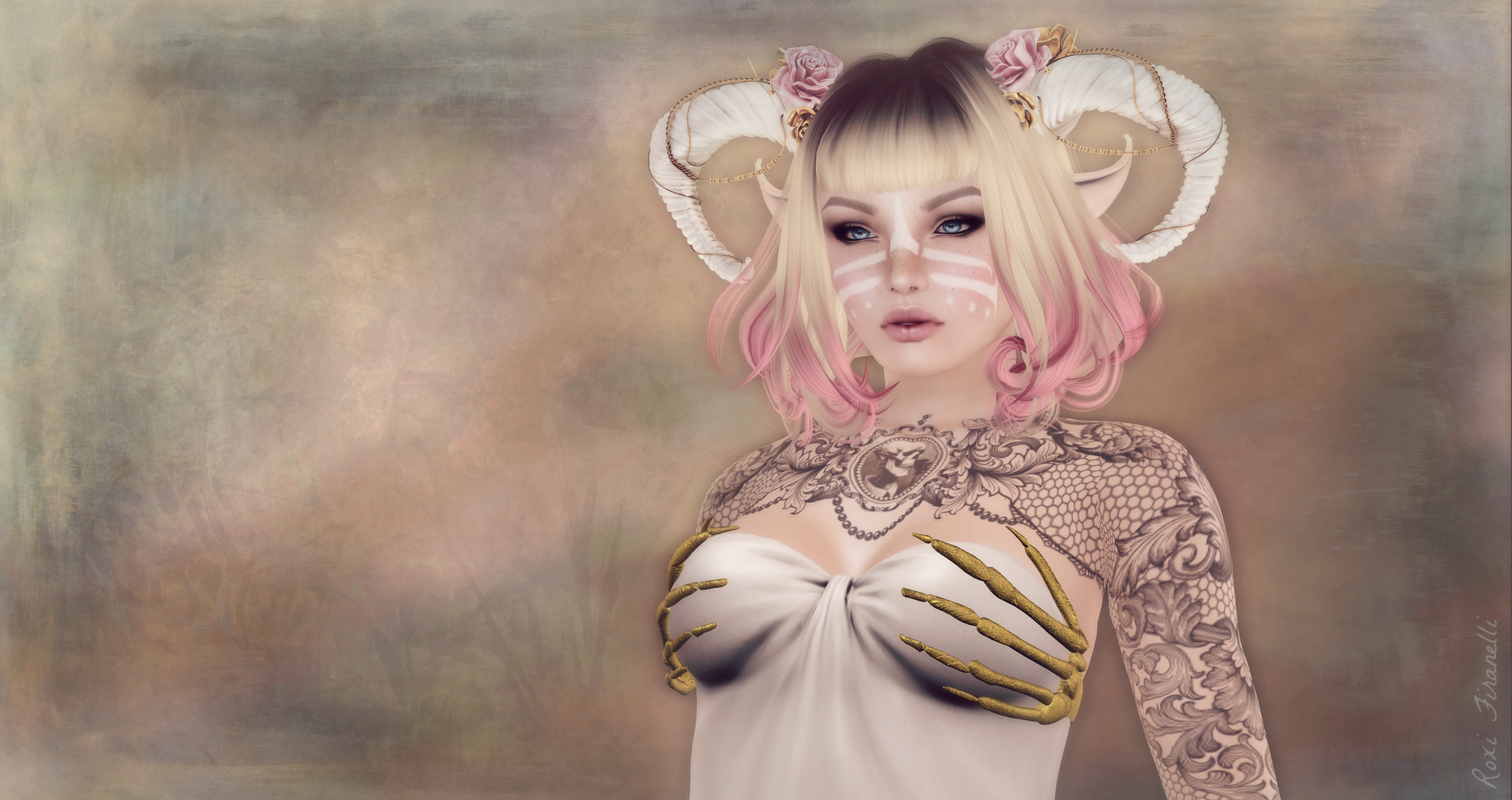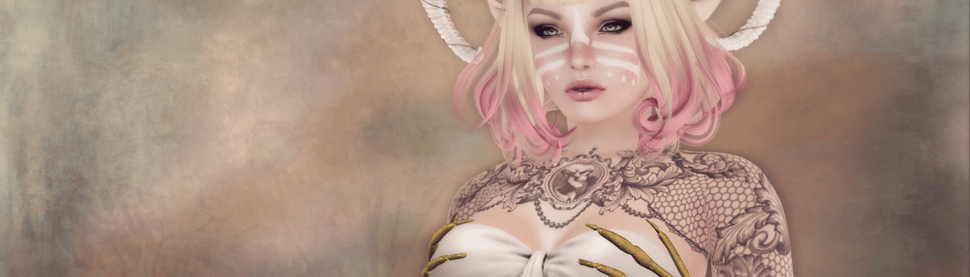 So this was a totally opportunistic shot…not planned at all. I finally got into Collabor88 this afternoon and scored the amazing Love hair from Lamb. I had been lusting after it everytime I saw someone wearing it in Flick’r. Got the Lust version too while I was there…but that’s for another time. As I am almost as much of a horn ho as I am a hair ho, I couldn’t pass up the Zenith horns…picked up the dress too…but again…another time. Having already opened and popped on the newest White~Widow tat that’ll be at The Fantasy Collective in a few days…which sports an awesome skeleton on the upper breast bone… I figured I’d pull out the skelly bra from Wimey. I guess it may seem odd to pair up pink and flowers and skeletons and horns … but I truly like the contrast. ♥