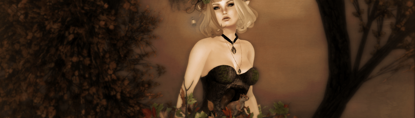 Temperatures are cooler, colors are muted with tones of orange and yellow and browns….perhaps some purple-ish red thrown in, you feel the need to drink spiced rum/wine/coffee/tea/rum and the pumpkins are out everywhere.  It’s time to pull out the boots and wear cool scarves!  Of course, in SL we can have Autumn every day if we so choose.  I took this picture the other day, but I wanted to wait until today to post it.  This is Boudoir’s newest outfit made especially for the season…it would be hard to resist even without the adorable squirrel peeking out of the hole in my tree tummy.  Along with some excellent Autumn-y jewelry finds from The Plastik at the newly opened Shiny Shabby and this Love hair from Lamb….which I love so much it hurts…I am ready for anything!  Except things that chase after and eat squirrels…I’m not ready for that.  I’m also still wearing the beautiful Aeryn skin from PXL that’s out at We Love Role-Play.  I’m not usually into the pale look, but this skin is so dewy and fresh and perfectly pretty!  The tree in the background is a free gift at Hayabusa…cool curves….go get one!