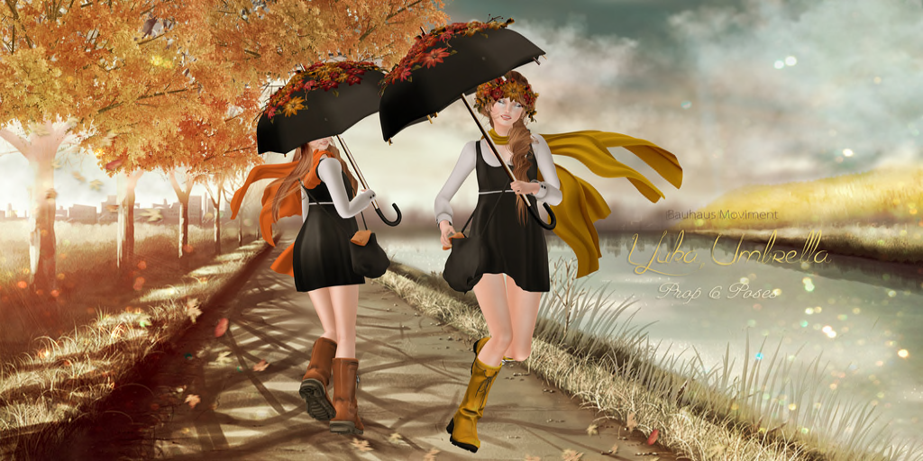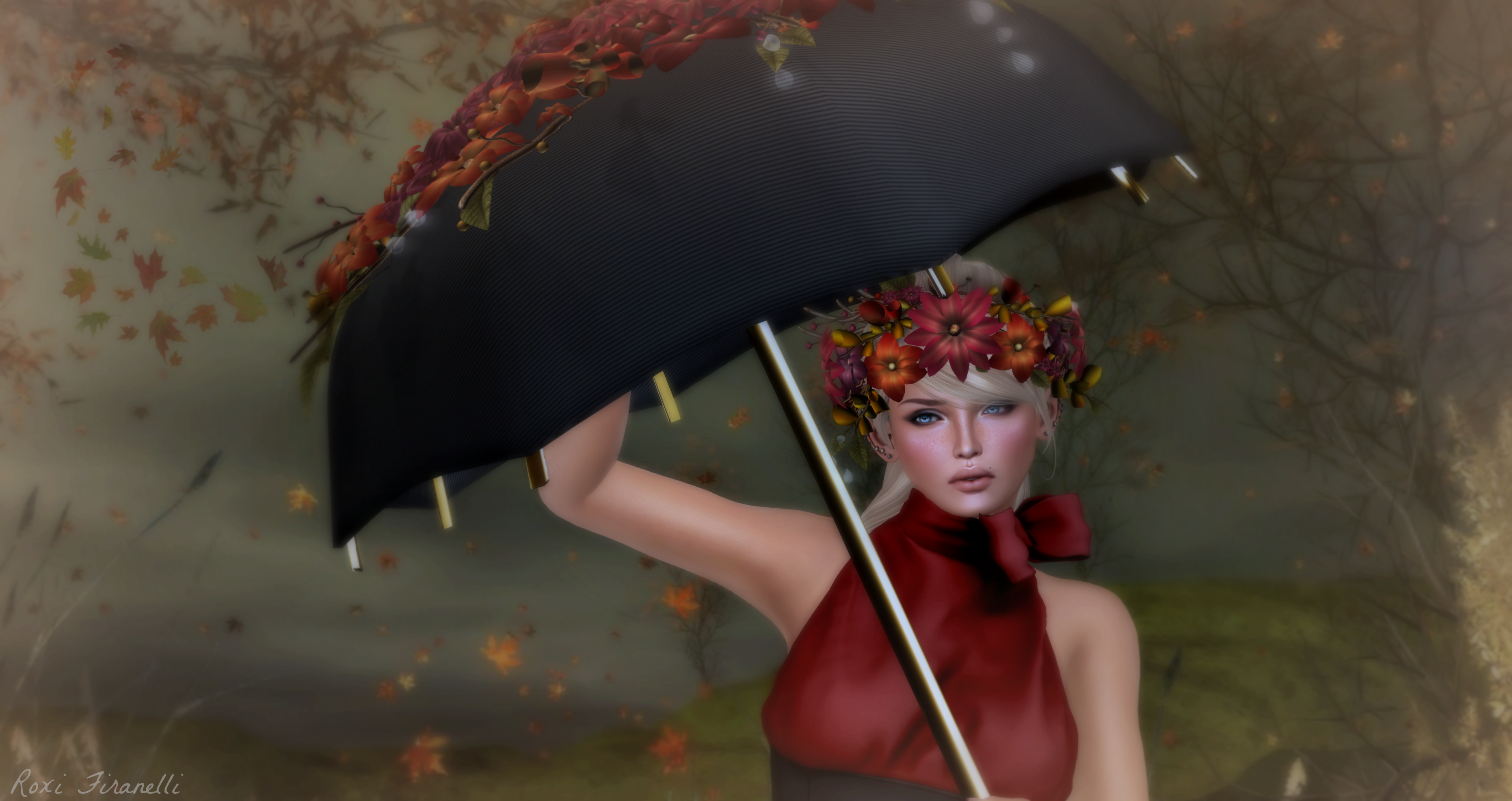 How I love, love, love anything hair or head related! Everybody’s got a thing….Cinder’s a shoe ho, Jo’s a skin ho, Darth is a clothing ho, Mae’s a blues ho and Jarath is well…just a ho ho. Me…I’m a “anything that goes on the head” ho…hair being the main obsession, but closely followed by circlets, horns, crowns, head dresses, wreaths, hats or any (and I do mean any) other kind of hair or head accessory. Not surprisingly, I did the happy dance when I saw the floral headpiece that Bauhaus Movement made for the upcoming round of Season’s Story. It’s just gorgeous….simply gorgeous…. and add to that a matching umbrella…WITH poses…bayam…perfection. Season’s Story opens on the 10th and will have all kinds of Autumn goodness, so mark your calendar and plan a trip ❤