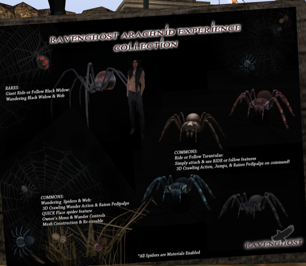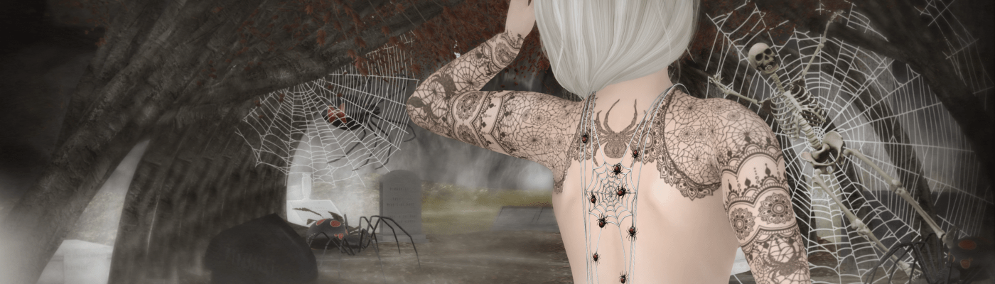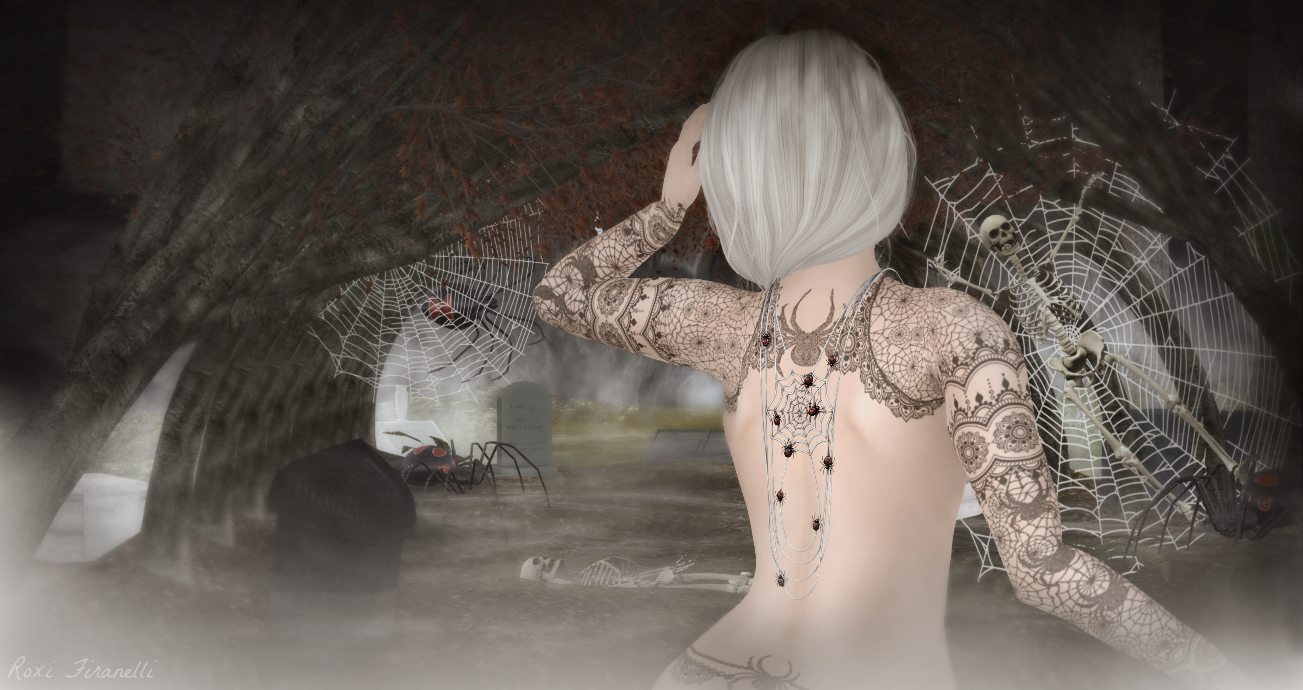 So anyway, it kills me that come Halloween everybody puts spiders on every damn thing…and actually, I tend to do the avoid thing with most of it. That’s pretty hard to do while walking around Wayward Halloween…freaking spiders every where…but such fabulous chit. When I do get brave to do something spidery it’s because it’s that well done and worth the ewwies. That and the creator is a good friend who will owe me soooo big (not naming names here Mr. Ravenghost). So lets see…the Vertigo tattoo is from White-Widow, so you know it’s quality. I’m wearing the rare from the gacha and I have a picture of the commons down below. Also on the spider list is the cascade necklace from EarthStones…so delicate and deadly…also @ Wayward. Finally…the pièce de résistance ….Ravenghost’s freakishly big black widow spiders. This is the rezzable version…which moves around on a rezzable web, there is also a rideable….ummm….no thank you. The Black Widow is the rare, you could also get the commons…which are tarantulas…..shivers…(jeez are they hairy!).
