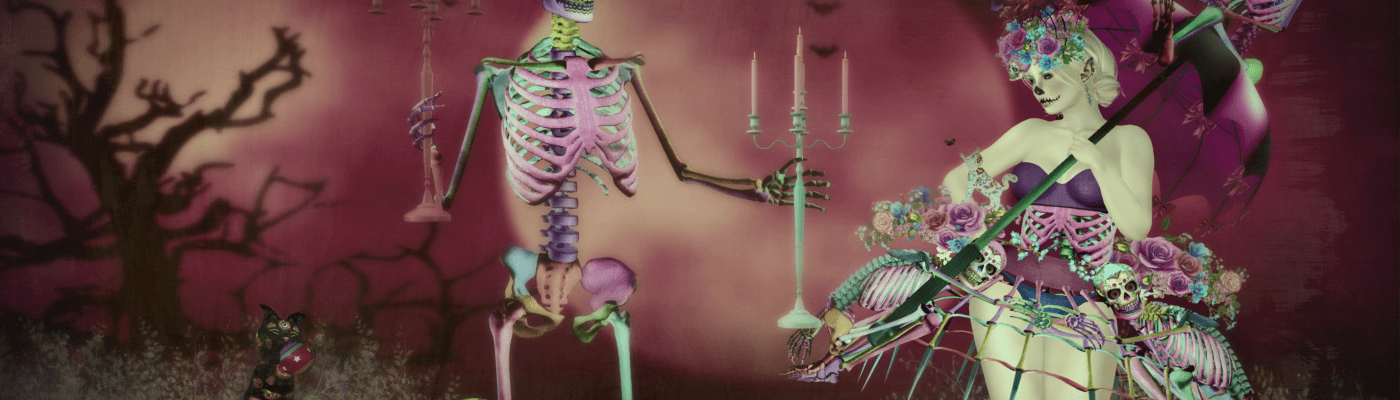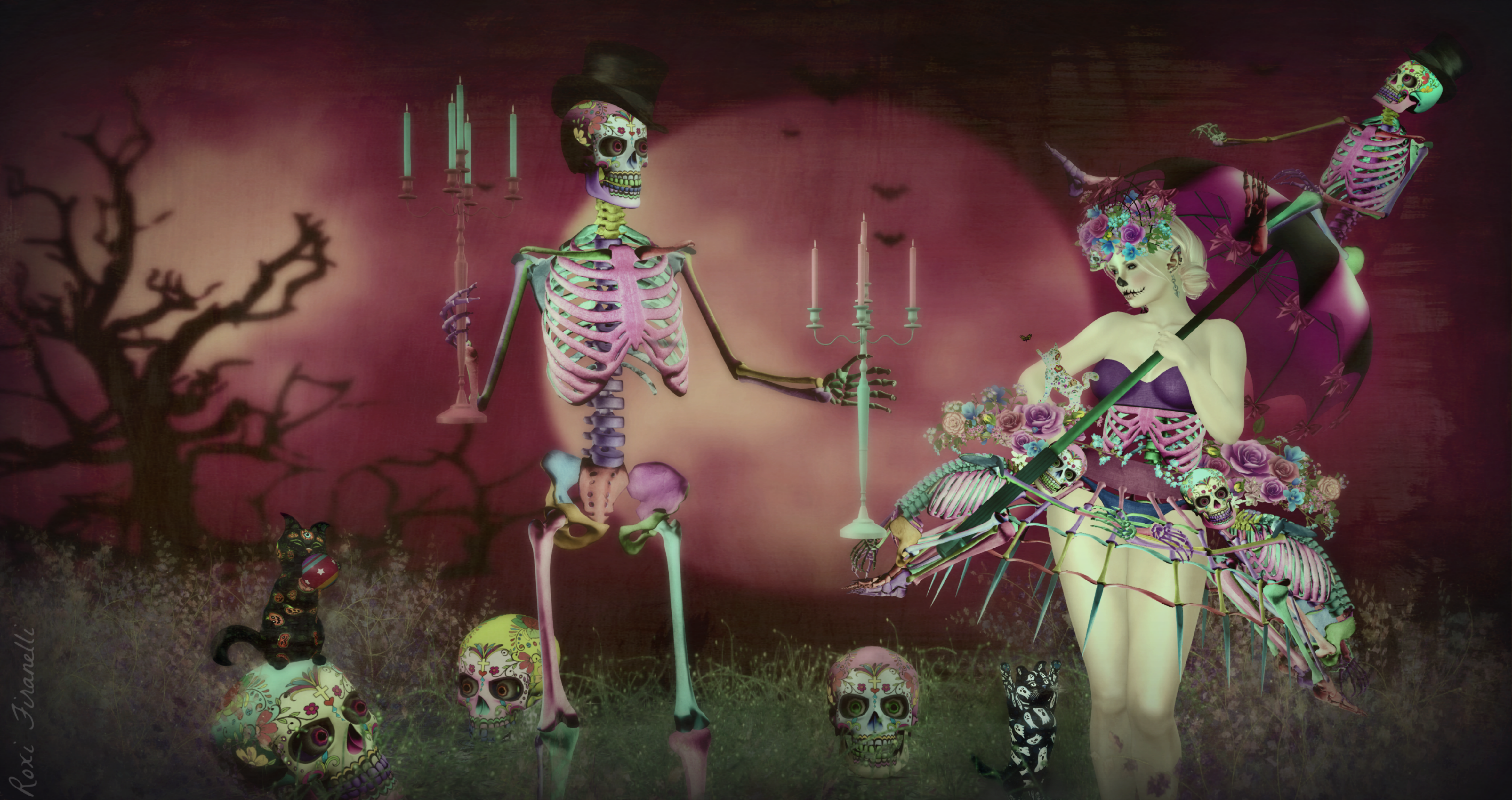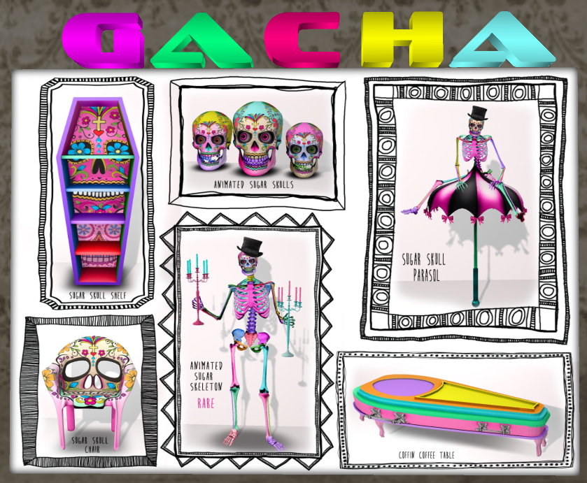 So….absolutely loving the pastel-y sugar skull thing Boudoir has going on….it makes Halloween a bit more fun and a bit less dark and scary. The Catrina outfit comes complete with not much of a body, a couple of devoted groupies hanging off the skirt, headpiece, face tattoo and fitted shoes for Slink high feet. The rest….skeleton, parasol and 3 skulls are from Boudoir also in a gacha machine. You can’t not love going to the store and wandering through the Halloween section….amazingly fabulous outfits, home &garden and whatnots for the season.