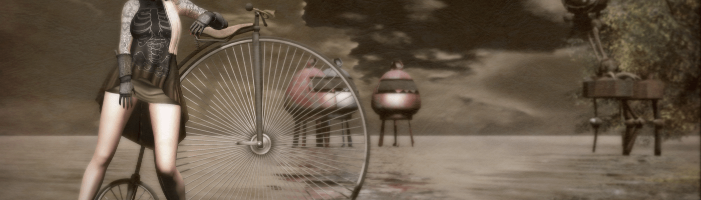 More awesomeness fro We Love Role-Play! Ravenghost, who never ceases to amaze me with his imagination and sense of wonderment, has made this Penny Farthing bicycle for the event. It is, of course, totally ridable and entirely too much fun. I have been working on my riding skills and have challenged Raven to a race (interestingly, he hasn’t been on in the last few days ….hmmmm …coincidence…I think not). To go along with my kick ass bike, Pure Poison has this awesome steampunk gas mask out at We ❤ RP….I love everything steampunk…and works well with the gauntlets from sYs and the Freya hair from Ayashi. Staying in the odd post apocalyptic-ish mood is The Plastik. You can always count on interesting from Aikea and this outfit is no different. The cool Lucine dress is at the Thrift Shop right now and the bad ass Wander boots are at Collabor88.