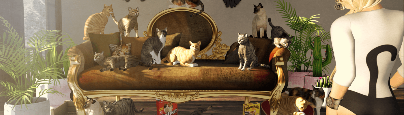 You’d think I had cats in rl…I don’t…not a one. The beauty of SL is that I can have a million cats (maybe not that many…even though I’m told by SOME people that I am over run with them) and not have to deal with cat hair all over the furniture, not to mention litter boxes. Boudoir has this fantastical cat sofa out that is sure to charm even the most ardent dog people. Even covered with 14 gorgeous kitties, the sofa still exudes elegance and charm. There are two options in the folder, a rezzable sofa (16Li) with 12 sit animations and a wearable one….so you can just plop down wherever you happen to be ❤