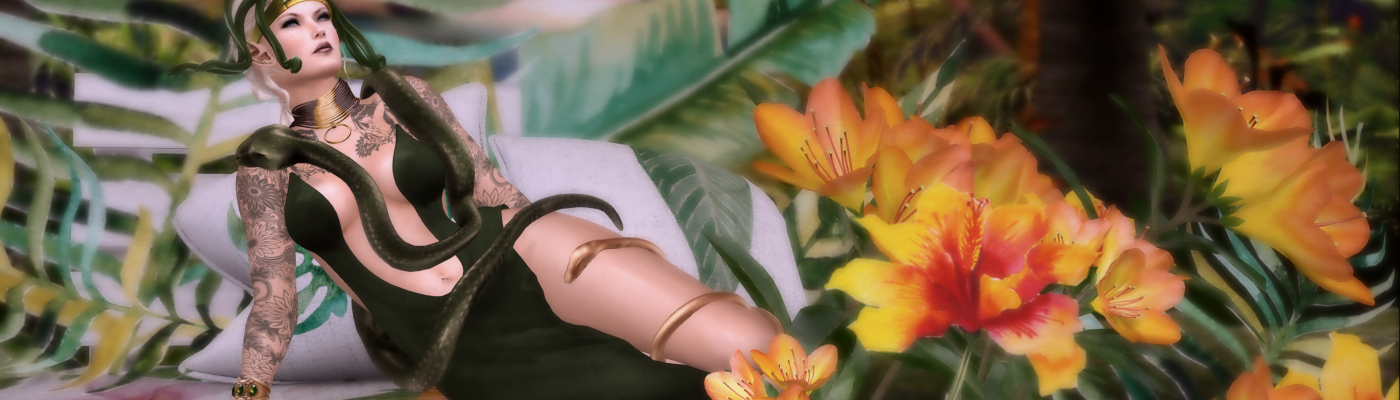 I’ve been looking for the perfect reason to use Boudoir’s new tropical lounge and when I saw Storybook’s Medusa gacha at Epiphany…well…it seemed like an obvious fit…snake in the garden and all that. Medusa is only 75L per play AND you can trade in your extra’s for the awesome exclusive crown! Romp is still in full swing too, no kidding… packed to the brim, but when you do get in make your way over to the aisling booth and pick up this amazing Edyna collar…you simply cannot own too many collars and you can’t get better than aisling. ❤