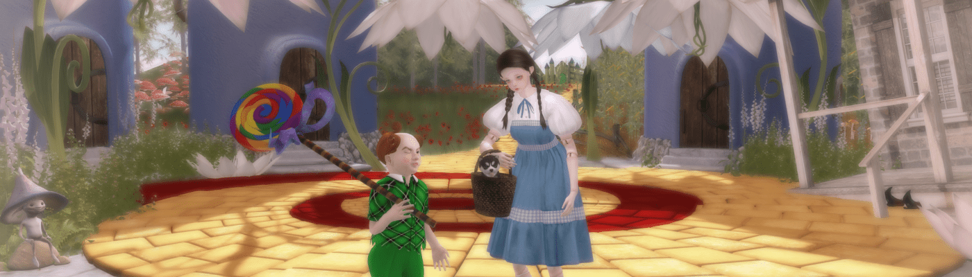 Does the Wizard of Oz just make your heart swell with good memories!? When I was a kid I could always count on it being shown during Eastertime (along with Chitty Chitty Bang Bang… good times huh!) and I would set myself up in front of the Quasar (remember those tv’s?) and be a happy camper for 3 straight hours. I was probably in my 20’s before I stopped…and that’s only because you could rent it by then and watch anytime. We all need to follow the yellow brick road folks and the place to start is Enchantment! The Wizard of Oz themed event opened a few days ago and it’s all everybody’s talking about. Stop by and get your fix of Dorothy, the wicked witch, Toto and a flying monkey or two (you know you’ve always wanted a flying monkey!) Props to Darth for the setup, I left him to go to bed the other night while he was putting the yellow brick road together and I come back the next day to MunchkinLand, hills of fields and The Emerald City in the background… the man is focused and beyond talented. So talented in fact that as soon as Jarath saw the set, he immediately went and bought a flying monkey avie of the mp and started hopping about…so yeah…expect a monkey picture real soon. ❤