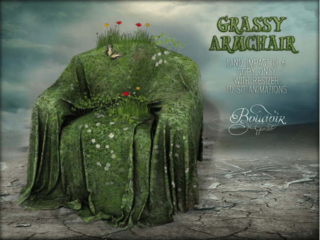 Ever just want to lay down in nature…yet still be totally comfy? Boudoir has the answer with her grassy furniture. The detail is amazing and the size can be modded to fit your space and stature. Look outside of the store for these pieces and more amazing fantasy landscaping to add to your secret garden for a touch of whimsy and wonder ❤