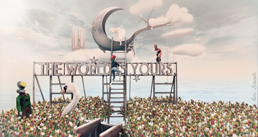 The Secret Affair is once again open…this round the theme is Imaginarium. So I’m looking at the totally whimsical ladder that by Nacht has at the event and I had to use it with the “The world is yours” sign that I had just bought at hive. I left it up to Darth after that to use his imagination…he did not disappoint. He has an amazing way of taking the vaguest idea and then pulling stuff out of his ass (i.e. = inventory). The poses, by the way, are mine…not the poses that are in the ladder. I liked the idea of not knowing whether he is following her up the ladder or if she is following him down…the monkey looks a bit confused about that also. Here’s Darth’s version … magical ❤