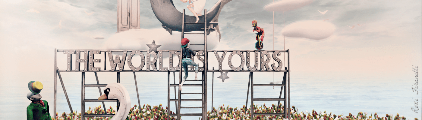 The Secret Affair is once again open…this round the theme is Imaginarium. So I’m looking at the totally whimsical ladder that by Nacht has at the event and I had to use it with the “The world is yours” sign that I had just bought at hive. I left it up to Darth after that to use his imagination…he did not disappoint. He has an amazing way of taking the vaguest idea and then pulling stuff out of his ass (i.e. = inventory). The poses, by the way, are mine…not the poses that are in the ladder. I liked the idea of not knowing whether he is following her up the ladder or if she is following him down…the monkey looks a bit confused about that also. Here’s Darth’s version … magical ❤