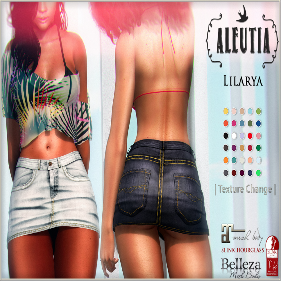The Spoonful of Sugar Festival will be wrapping things up on April 2nd, so just a little less than a week left to go wander the 5 (yes, 5) fun sims of well over 100 designers…and all for a good cause….100% of the proceeds go to aid Doctors Without Borders. You can pick up this cute cute cute top and skirt from Aleutia (both with a diverse texture change hud) and celebrate Spring. ❤