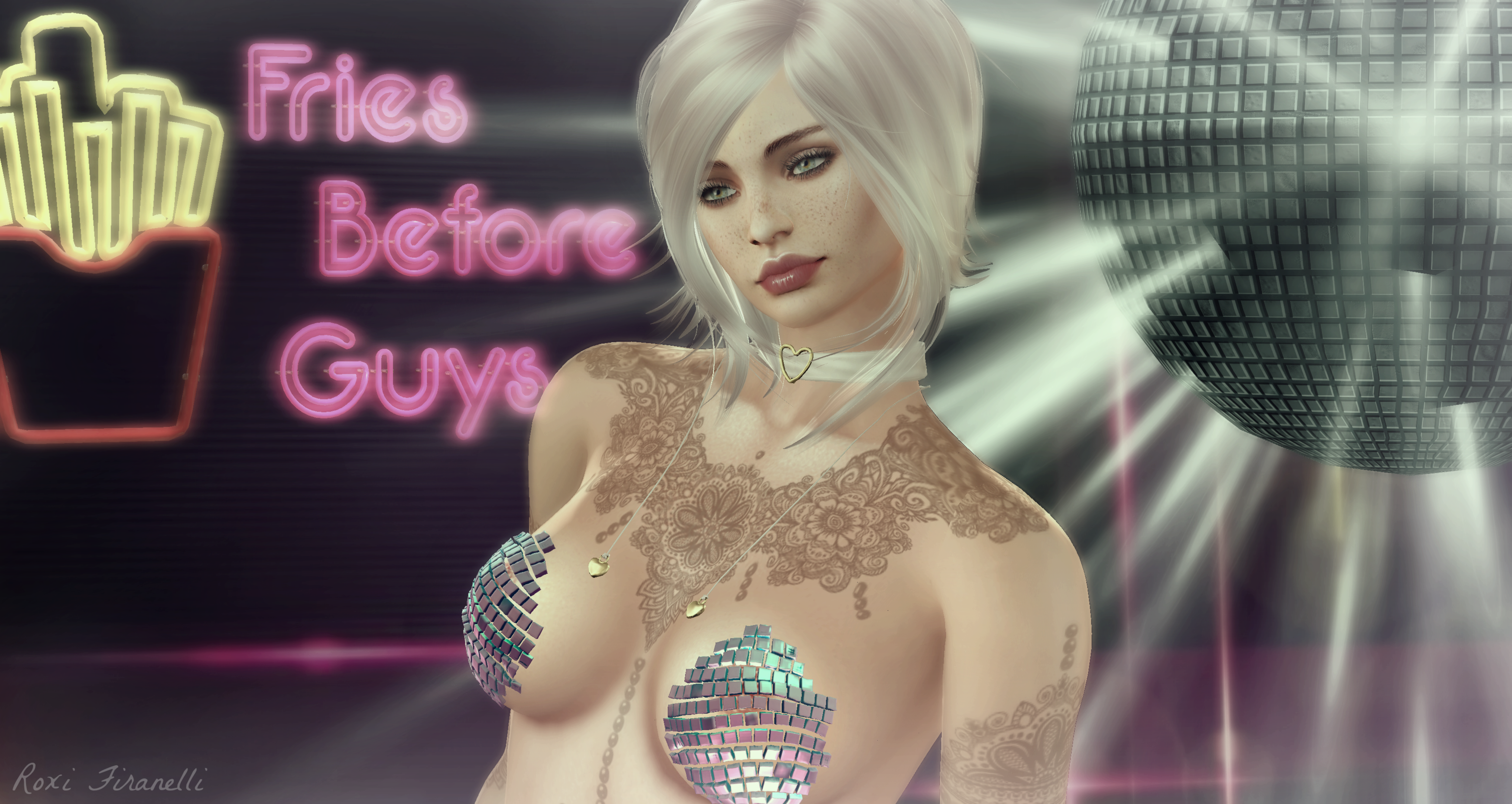 Stuff from Rewind includes the smexy …errrr…disco ball top ( boobie covers ?) from Storybook which I just fell in lust with. I don’t even want to think about how much fun it would be to peel all those little mirror squares off at the end of an evening. The choker and skirt are in a gacha from Vincue & Kibitz…pulled the rare skirt on the 3rd try…whooots! The super cute skates (that come with the socks and stockings) and knee pads are Reign….no rare that time sadly…..but it’s all good cause I sooooo wanted those skates. The sign, Fries Before Guys, is from peaches and could quite possibly be my new motto ❤