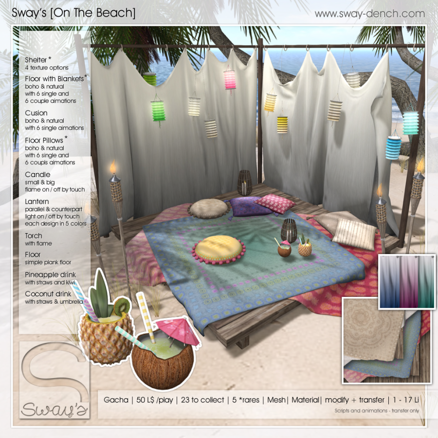 The Arcade opens in a little over 12 hours (midnight SLT) and I know peeps have been making lists and powering up the lindens. The Arcade shopping guide is a good place to peruse the goodies, but here’s a peek at what Sway’s will be offering. The “on the beach” set is everything you could need for a relaxing summer day for only 50L per play. Look below for the key and a shot of the reward (my favorite part of the collection!) ❤