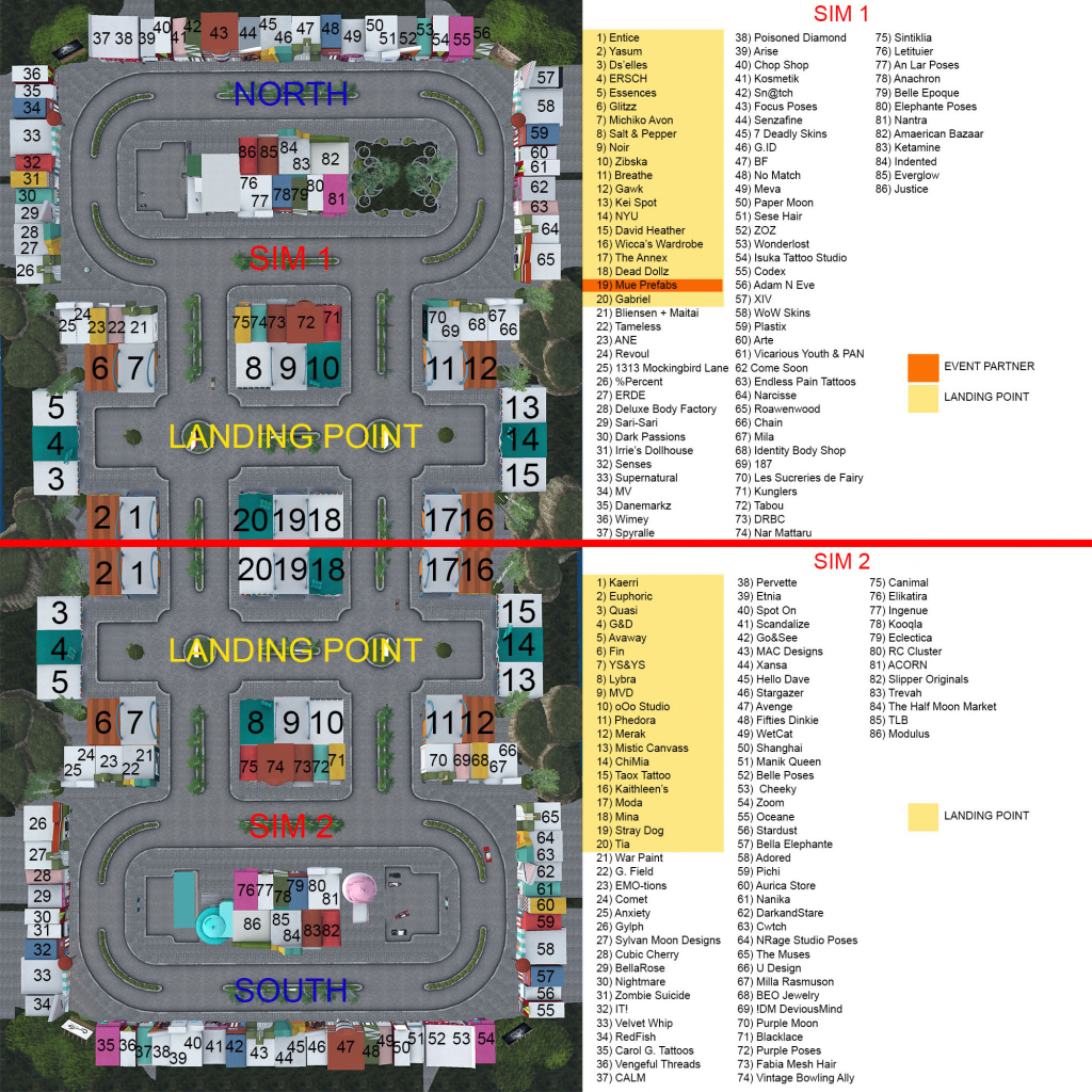 Vintage Fair opened yesterday to a crowd of peeps looking for some yesteryear. With 2 sims and almost 200 designers that should be easy. The sims themselves are fantastically decorated AND if you like the buildings you can buy them in the Mue store (sim 1 # 19)! Be aware though, for this weekend while the crowds are thick, there is an ARC limit of 100,000 to keep the lag down…so dress accordingly…. and pay attention to your hair! To quickly find out you avatar render complexity (ARC) go to avatar – avatar health – show avatar complexity information … bam! My look above scored in at 88,329…whoots! Check out the shopping guide and the map below for preparation ❤
