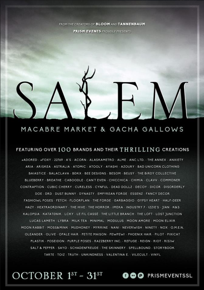 Salem has officially opened peeps! All kinds of “boil, boil, toil and trouble” stuff to spook up your SL. Start with this amazing cropped hooded jacket from Storybook … I looove how creeperly covering the hood is on the face….and the long sleeves over the hands… and the fact that you can so easily layer it over another top. It fits perfectly over Schadenfreude’s Pentatank! The landscaping is from the story collection by anc, which is in the gacha section right when you log in (and is cleverly called the gacha gallows for a good reason). You have the month of October to get to to Salem, but make it over soon so you can get all decorated up for the spooky season ❤