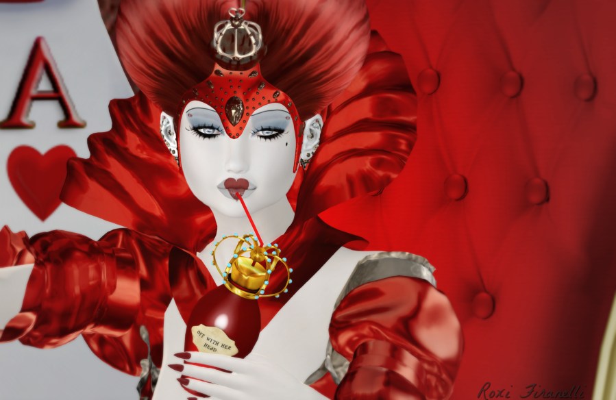 Love this, Roxi!!! I’ve really enjoyed the entire Alice in Wonderland theme at Enchantment this round. The build was fantastic and the creators/vendors all came up with unusual, fun, & creative products for it. Wonderful look and set! Now I want to go back and win that “Off with her head” drink & hair!!! ♥♥