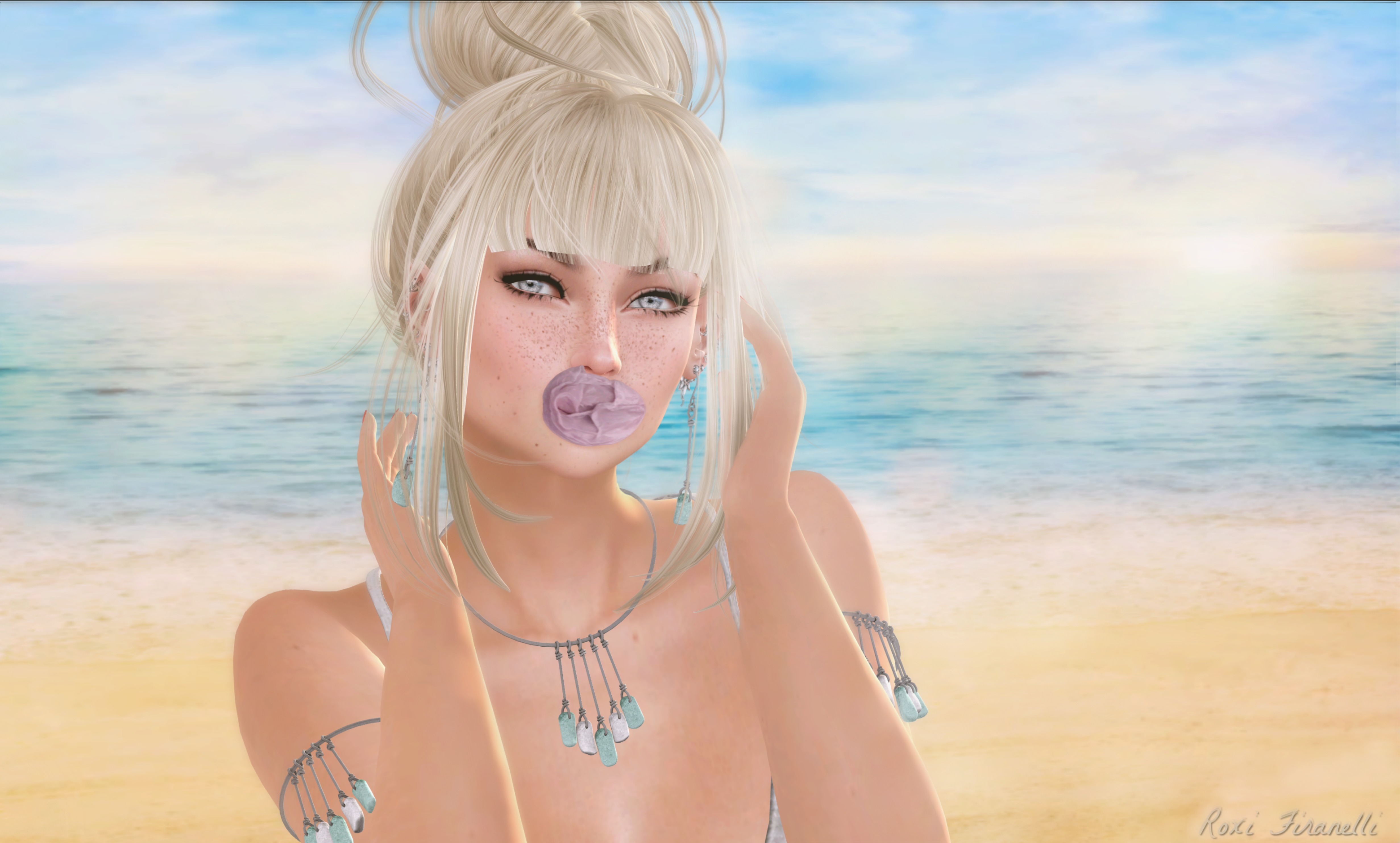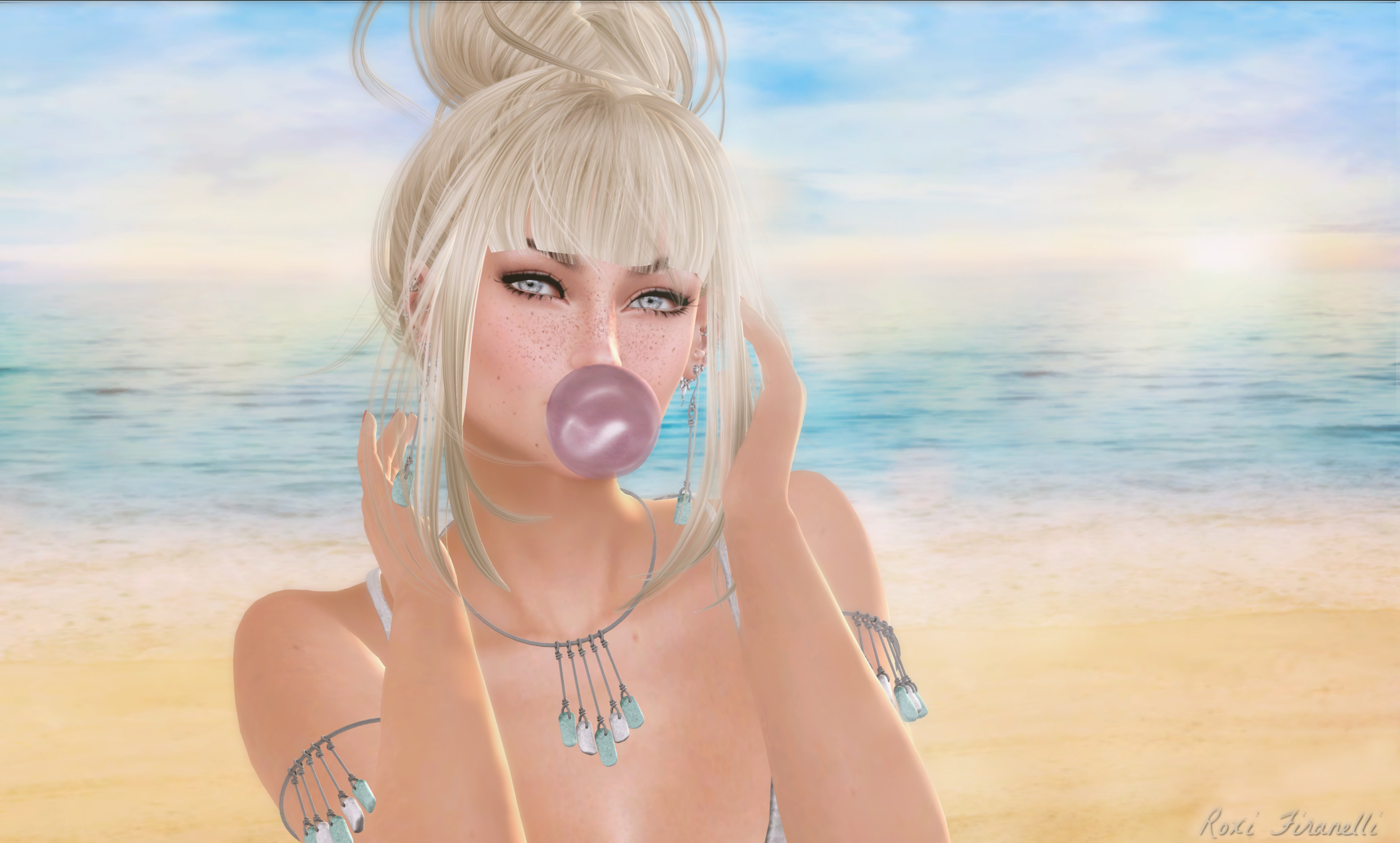 LAQ’s newest bento head is out at Collabor88 (which just opened the other day). Cherry is absolutely adorable and Summer fresh. I’m wearing the Cherry head, shape, brows and applier (in the 1.5 tone) and I used the freckles option on my hud cause…freckles. I didn’t edit any of that pretty face (I just put a bit more sunlight to the right) so you can see exactly what you’re getting. Don’t like the bubble? Cool…it’s separate anyway! There’s a super cute motion captured chewing and bubble blowing animation that comes with the bubblegum and it is sure to make you happy as you make your way around SL this Summer ❤