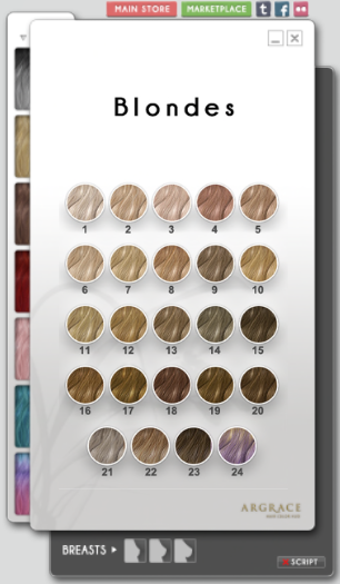 So about the new store…it’s gorgeous…and it’s cleaned out. There are only the 3 new hair’s there. All the old hair is gone…just room to grow. The older hair is also not on the Marketplace, which is a new page…but maybe they plan on adding them. I will ask and get back on that. Each new set, like the 24 shades of blondes, are 300L. If you want the fatpack (essentially 168 shades) it’s 1,000L.