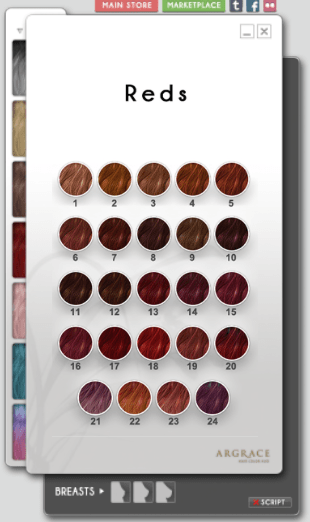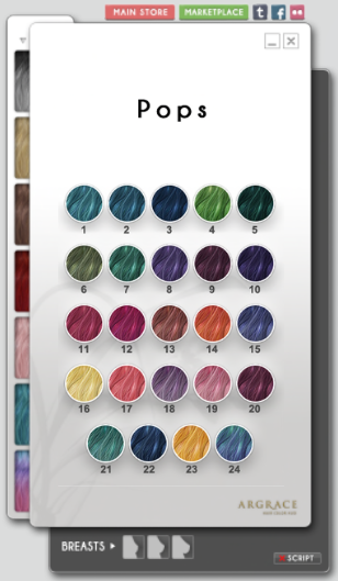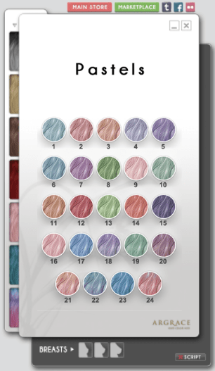 Also, big news!! Argrace is back! The team took a few months off and did a total redo of their store and have debuted it and 3 new hairdo’s. Other newness includes a new gift system, new textures AND some new colors….including…..hold me back…..pastels!!!!! And the ombres….soooo gorgeous! I have always hel that Argrace had some of the best texturing quality around and it’s only better now. You can also see on the HUDs below that you can adjust your hair according to your boobosity. I’m wearing kitsuno, a long banged ‘do that comes with 4 styles to choose from. I can’t tell you how happy these bangs make me…and with the dimples and bubblegum…..yup.
