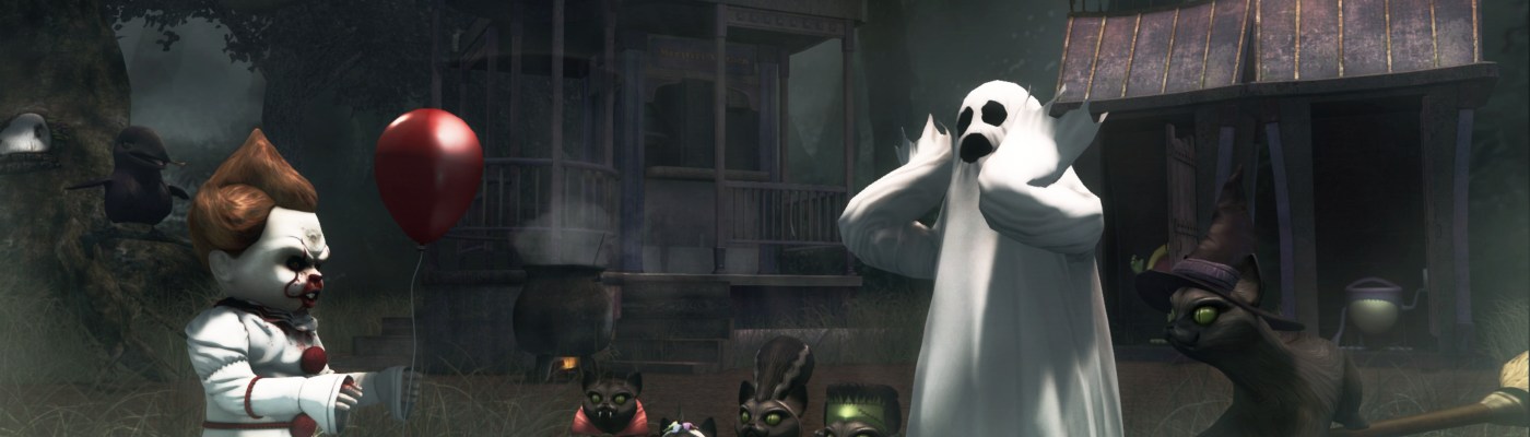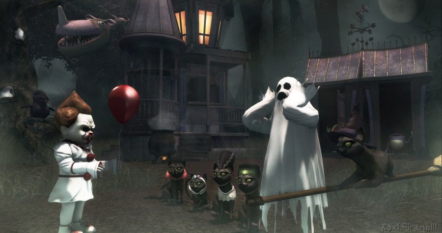 So, first things first. I saw the vendor ads for Black Bantams Baby Penny and went “NOPE”. I’m not a fan of IT (I can’t handle seeing kids die in novels, movies…whatever medium…and hope I don’t spoil anything for you but dayam, Stephen King loooves to kill off kids) nor am I a fan of scary clowns (totally cool with happy clowns) or scary children (so yeah, no Children of the Corn here)…so this little Penny chick definitely struck up the NOPE in me. Darth, on the other hand, looooved her. I had written her out of my short term memory until the other day when the new popup Arcade opened. I, of course, did not go to the Arcade….I went to Seraphim’s Yard Sale (my go to for Arcade commons) and wandered the aisles looking for spooky things I could not live without. When I saw the screaming Mutresse ghost I fell in love. He looked scared….really scared. What would scare a ghost? That freakish child clown that’s what! So yeah..I decided I needed the freak for a funny shot…especially when I saw the Nope cats….cause Bride of Nope just cracked me up and the look on their faces says it all. NOPE ❤