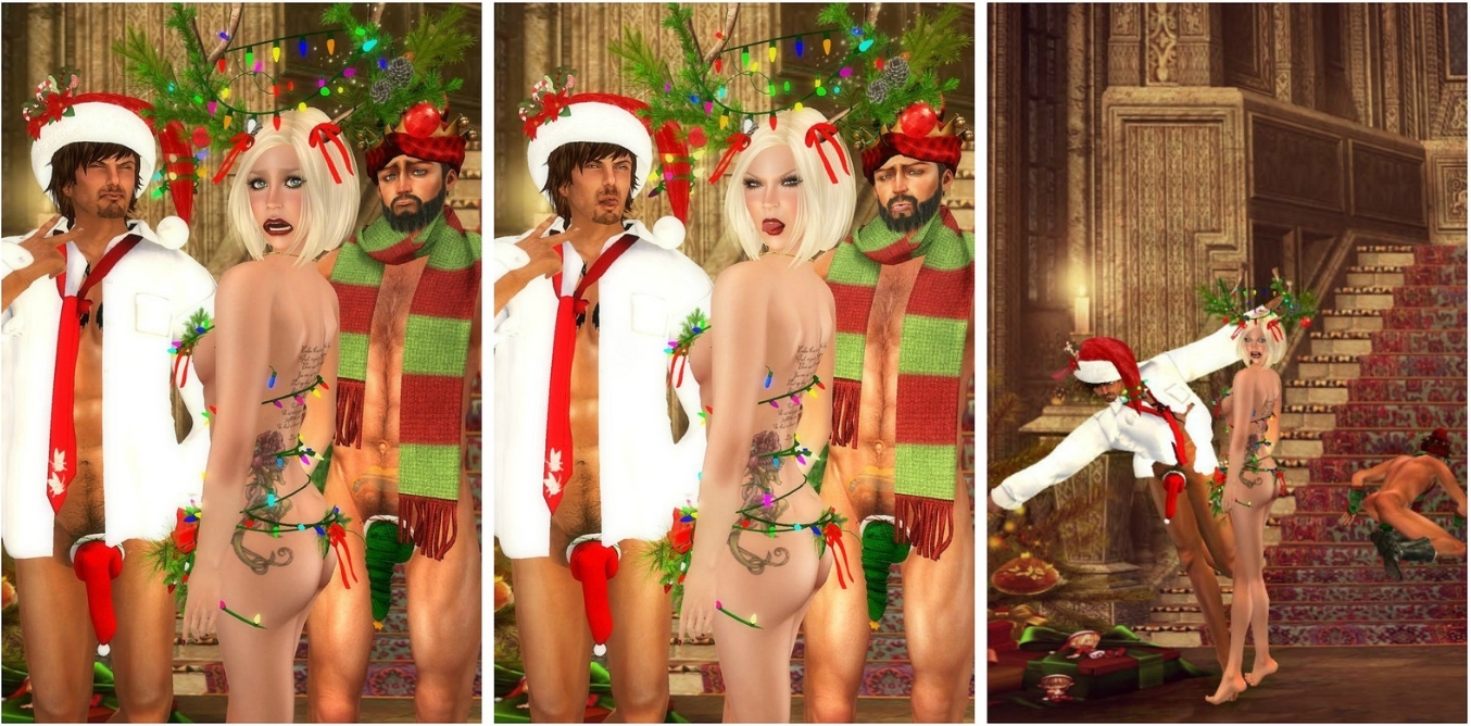 On a totally nonrelated side note and smack in the middle of the post, I thought I’d slip in a cute ho ho ho pic Jarath, Darth and I did years ago, 2013 actually. Before mesh bodies, heads and clothing….nothing but system here peeps (well, to be honest, Darth and I had the new Slink hands and feet and we thought we were the bomb!). As I was taking a picture with 2 ridiculously juvenile males, it took quite a bit of time and made for hilarious outtakes. If anyone wants to check out the original post, here it is. Be warned though, It’s all system stuff (although I guess the socks may still work) and I had only been blogging a few months and hadn’t yet figured out how to put links, so you’re on your own there. ❤