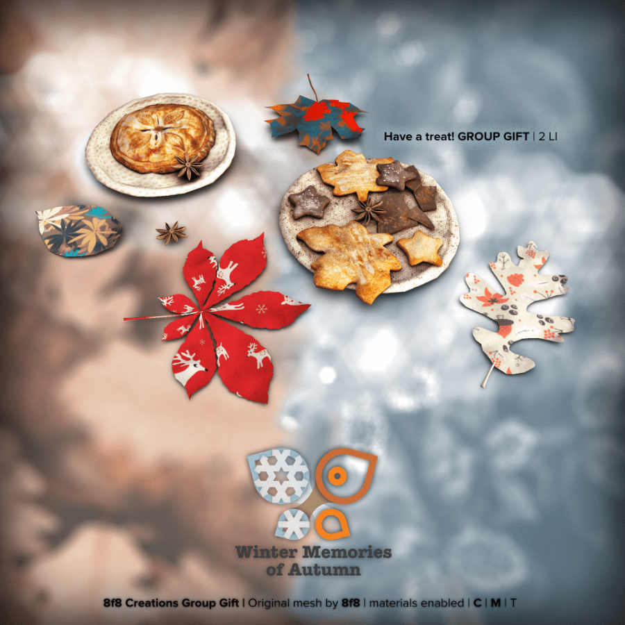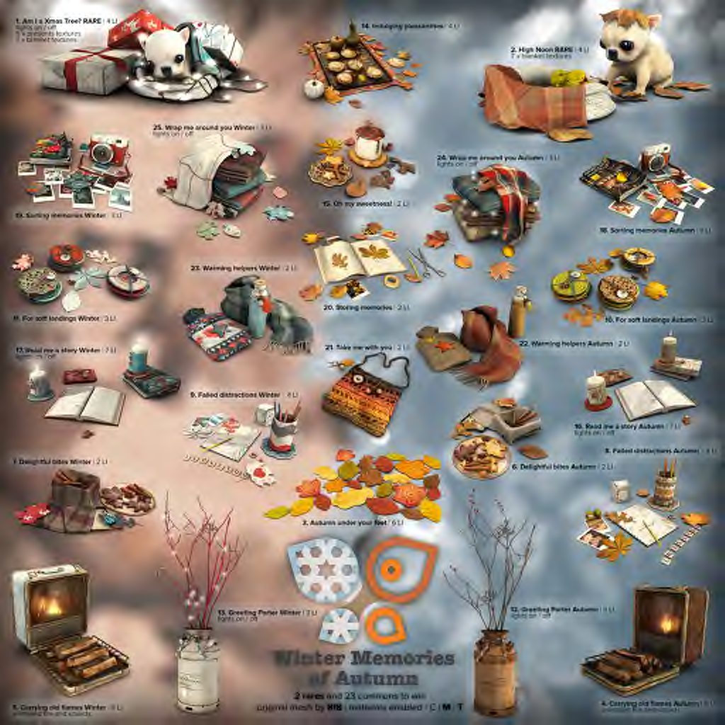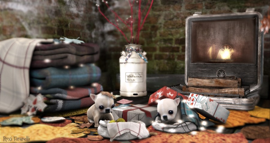 This newest collection is called Winter memories of Autumn and has a mix of the two seasons in the decor and food. There are what would look to be duplicates in the collection, but when you look, they are different seasonal versions of the same item. So the blankets have a winter version and an Autumn version. The 2 puppies are the rares. The gift boxes and blankets by them are all texture changeable via HUD, so they don’t have to have a Christmas vibe. I did the decor today cause….puppies….the food will be coming up in another post. BTW, there’s a group gift there also with the collection… check out the vendors below! ❤