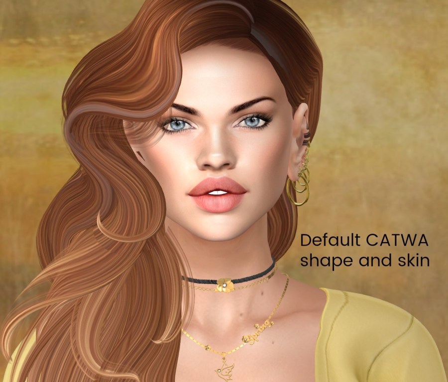 On all the following pictures, to see all the tones, I left Ultra for the lower high graphic setting, cause honestly, you never run around SL on Ultra (except maybe the 1st week after you get a new computer). The lower graphics messed with the hair a bit and made it clip slightly. I also went to a straight up editing pose, which didn’t work great for the hair either (but these aren’t about the hair). So you know when you buy a CATWA mesh head it comes with a default skin (from The Skinnery, you can get matching body appliers at CATWA), a shape, brow shape, hair base, eyes, teeth, ears..the whole shebang. The 1st picture below is what you get right out the box. CATWA all the way. You’d definitely want to get a hairbase that works with this particular hair though ❤